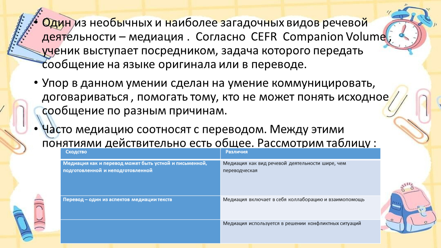 Один из необычных и наиболее загадочных видов речевой деятельности – медиация . Согласно CEFR Companion Volume , ученик выступает посредником, задача которого передать сообщение на языке оригинала или в переводе.