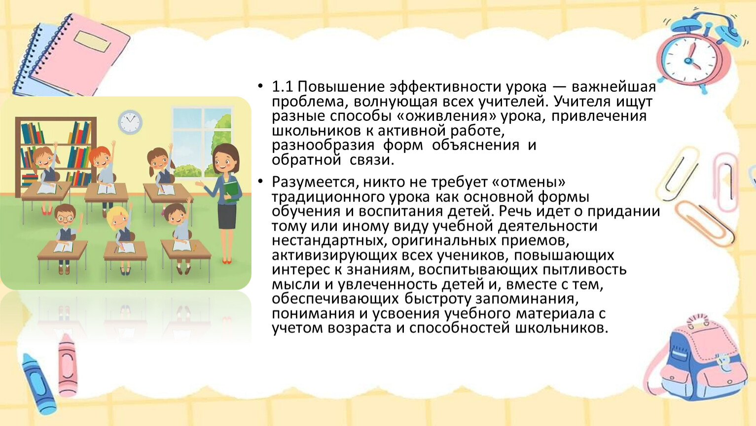 1.1 Повышение эффективности урока — важнейшая проблема, волнующая всех учителей. Учителя ищут разные способы «оживления» урока, привлечения школьников к активной работе, разнообразия форм объяснения и обратной связи.