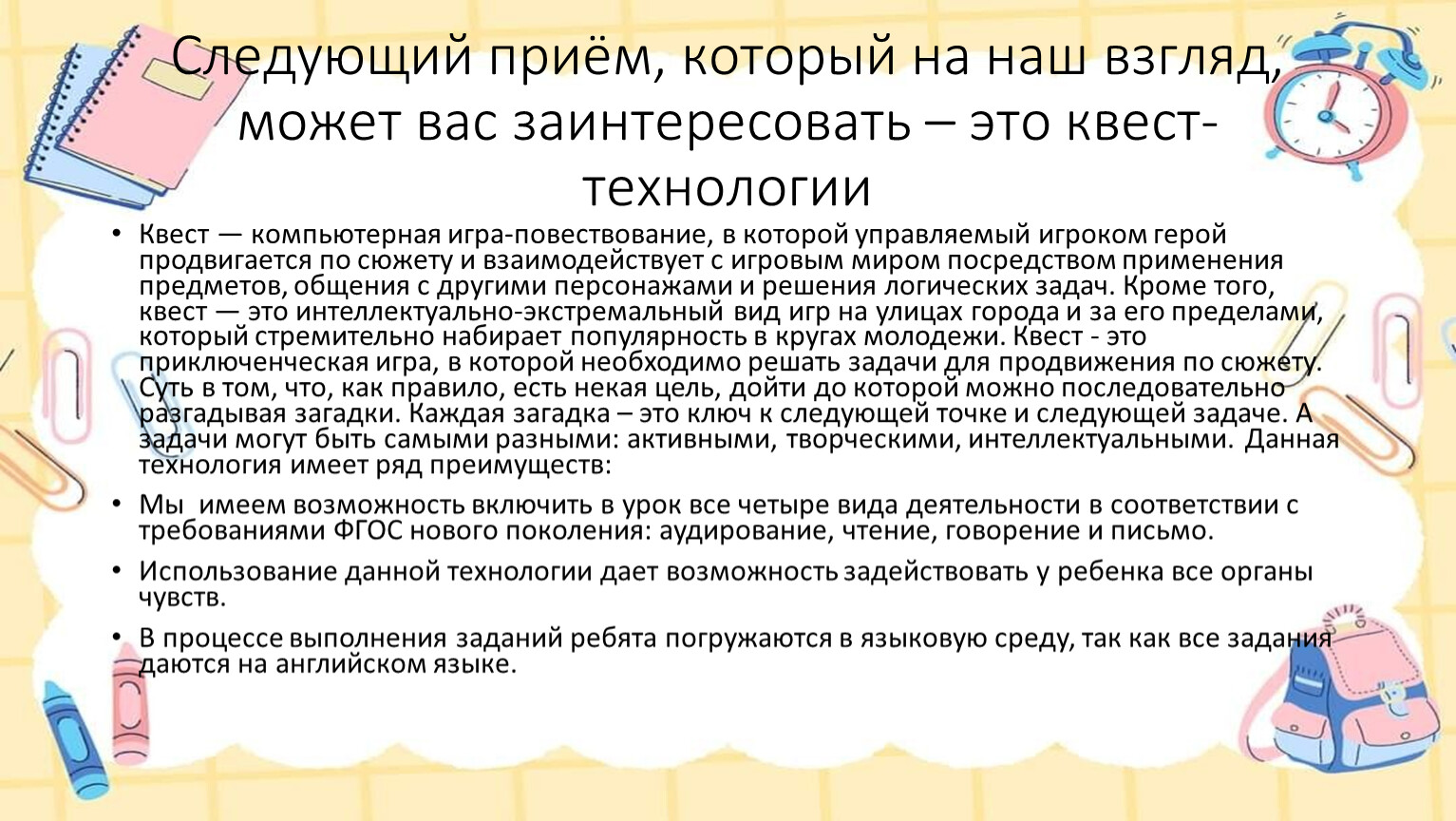 Такой урок является весьма показательным с точки зрения здоровьесберегающих технологий, так как учащиеся находят задания в разных уголках классной комнаты, школы или на улице в зависимости от масштаба проведения квеста, и для этого им приходится много двигаться.