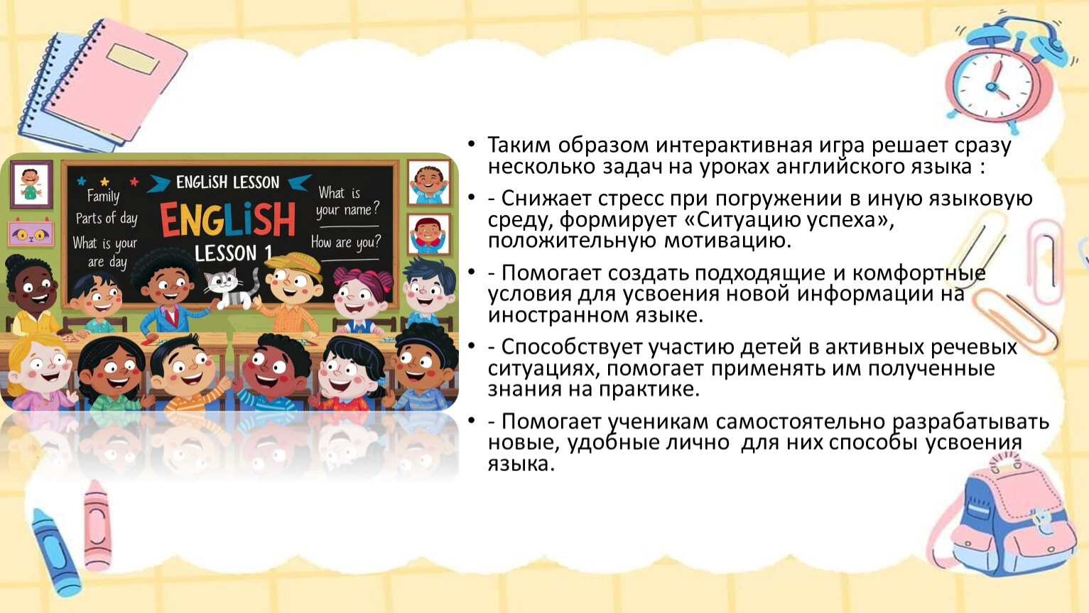 - Помогает создать подходящие и комфортные условия для усвоения новой информации на иностранном языке.