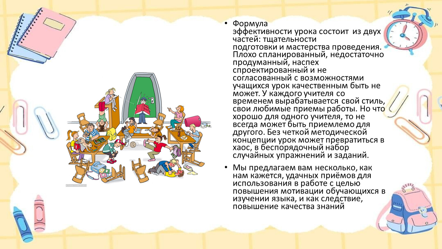 Формула эффективности урока состоит из двух частей: тщательности подготовки и мастерства проведения. Плохо спланированный, недостаточно продуманный, наспех спроектированный и не согласованный с возможностями учащихся урок качественным быть не может. У каждого учителя со временем вырабатывается свой стиль, свои любимые приемы работы. Но что хорошо для одного учителя, то не всегда может быть приемлемо для другого. Без четкой методической концепции урок может превратиться в хаос, в беспорядочный набор случайных упражнений и заданий.