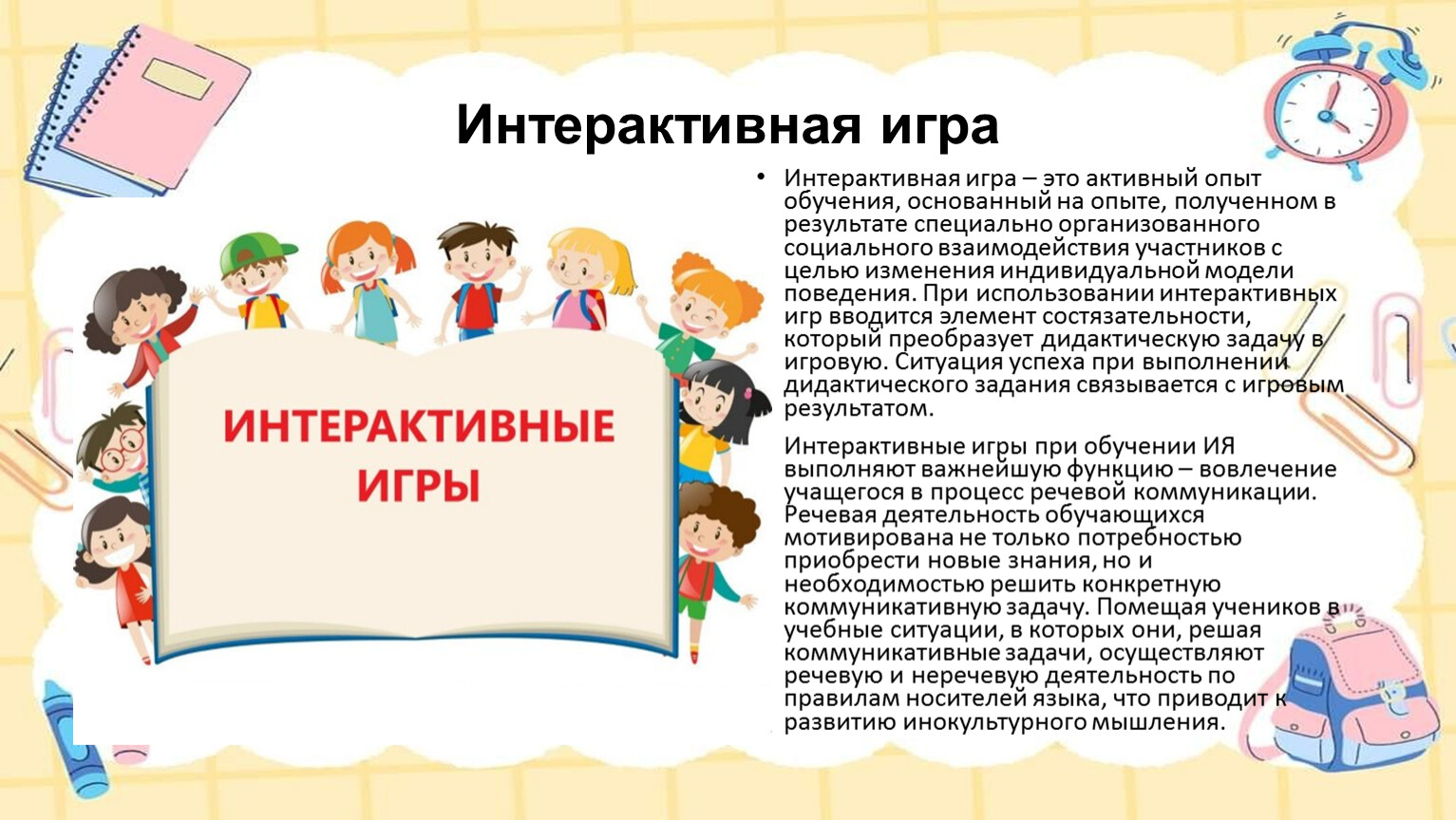 Интерактивные игры при обучении ИЯ выполняют важнейшую функцию – вовлечение учащегося в процесс речевой коммуникации. Речевая деятельность обучающихся мотивирована не только потребностью приобрести новые знания, но и необходимостью решить конкретную коммуникативную задачу. Помещая учеников в учебные ситуации, в которых они, решая коммуникативные задачи, осуществляют речевую и неречевую деятельность по правилам носителей языка, что приводит к развитию инокультурного мышления.