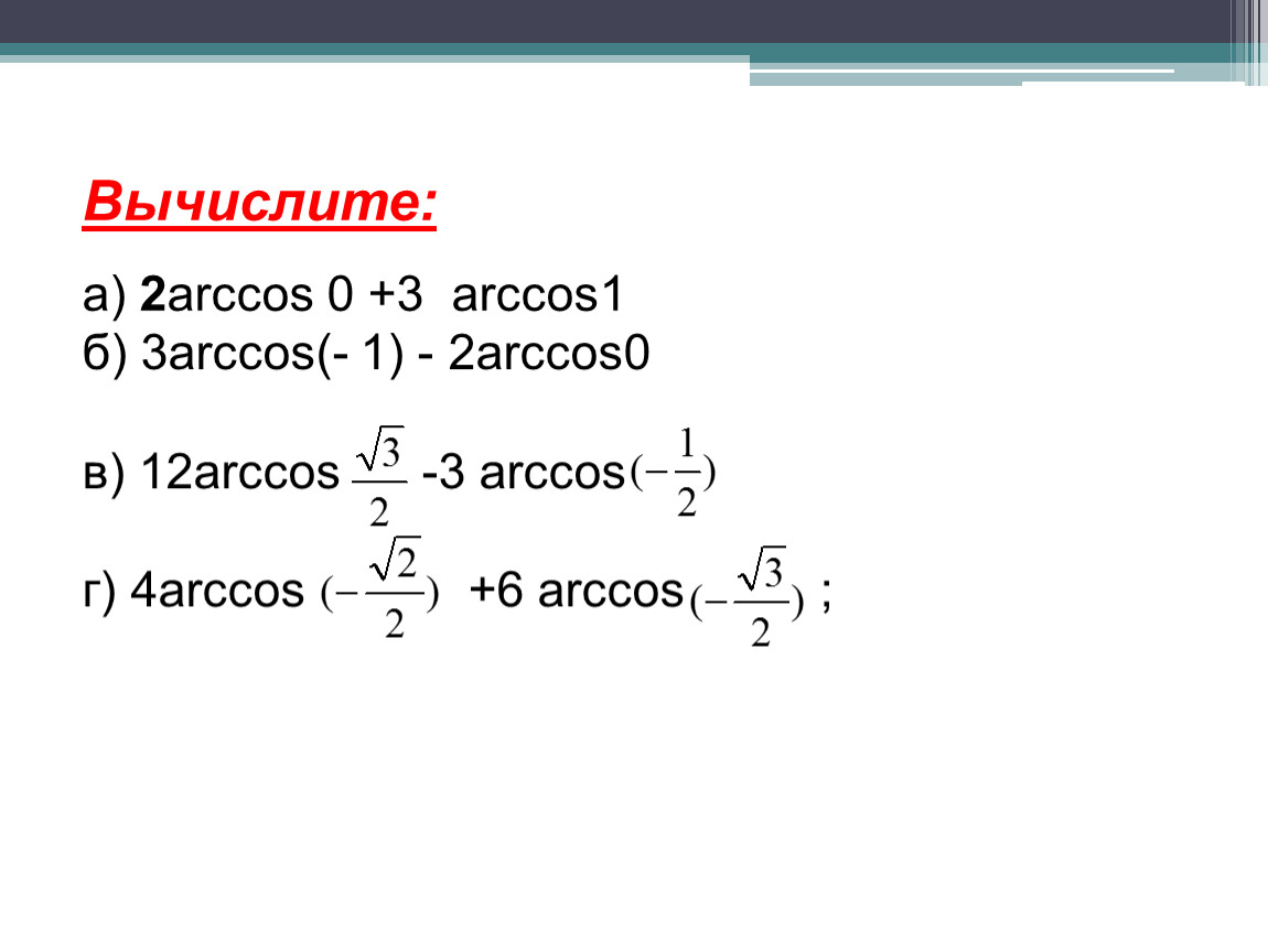 в) arcсоs1+ arcсоs (-1) – arcсоs (-0,5).