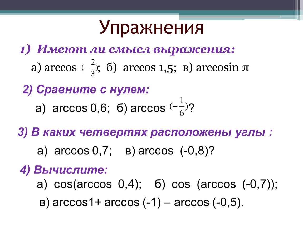 4) Вычислите: а) соs(arcсоs 0,4); б) соs (arcсоs (-0,7));