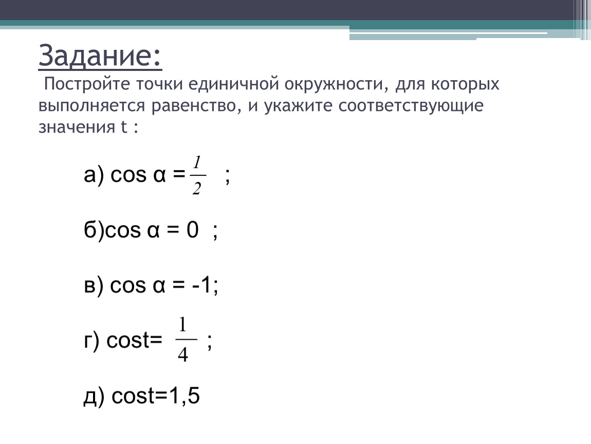 Задание: Постройте точки единичной окружности, для которых выполняется равенство, и укажите соответствующие значения t :