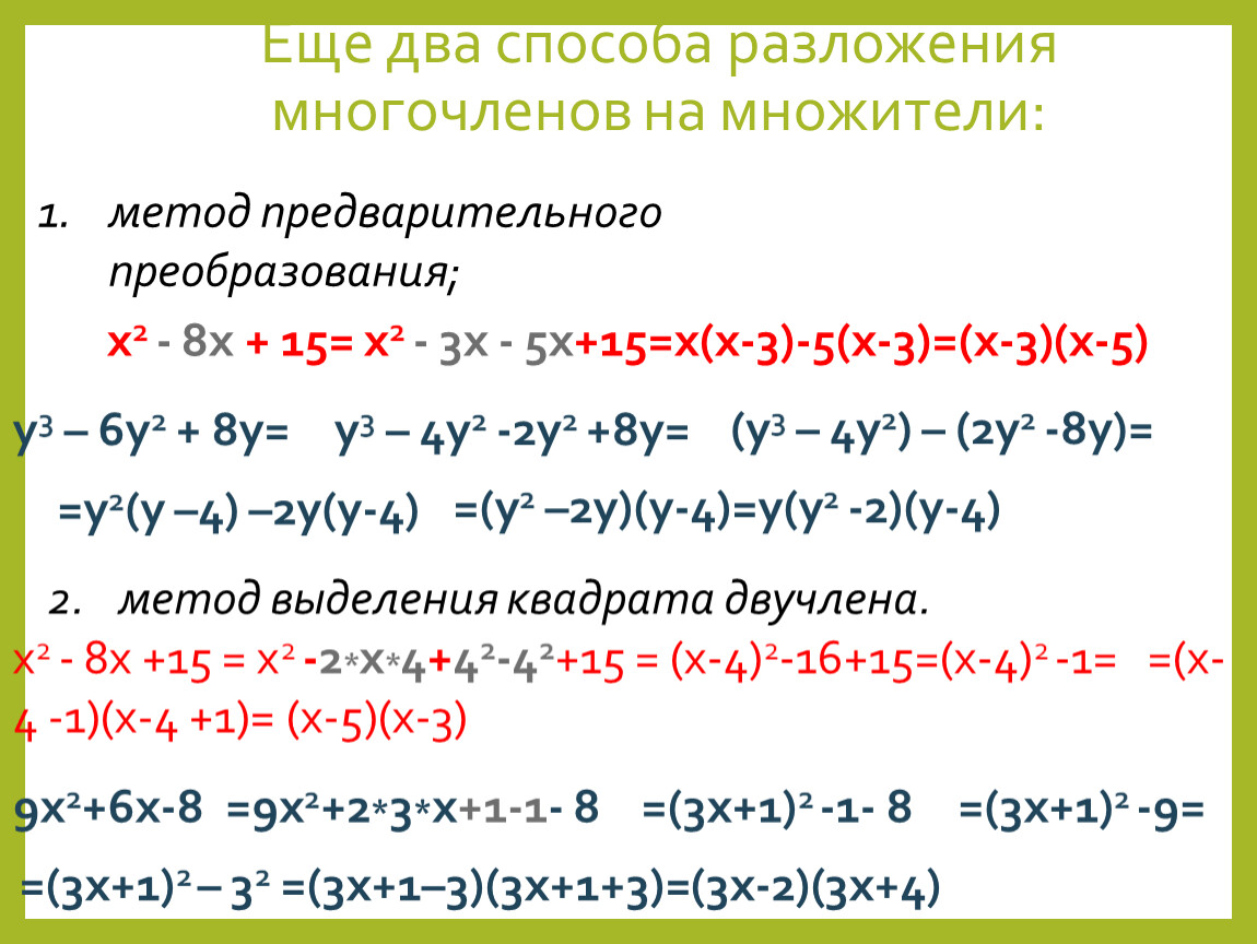 х2 - 8х + 15= х2 - 3х - 5х+15=х(х-3)-5(х-3)=(х-3)(х-5)