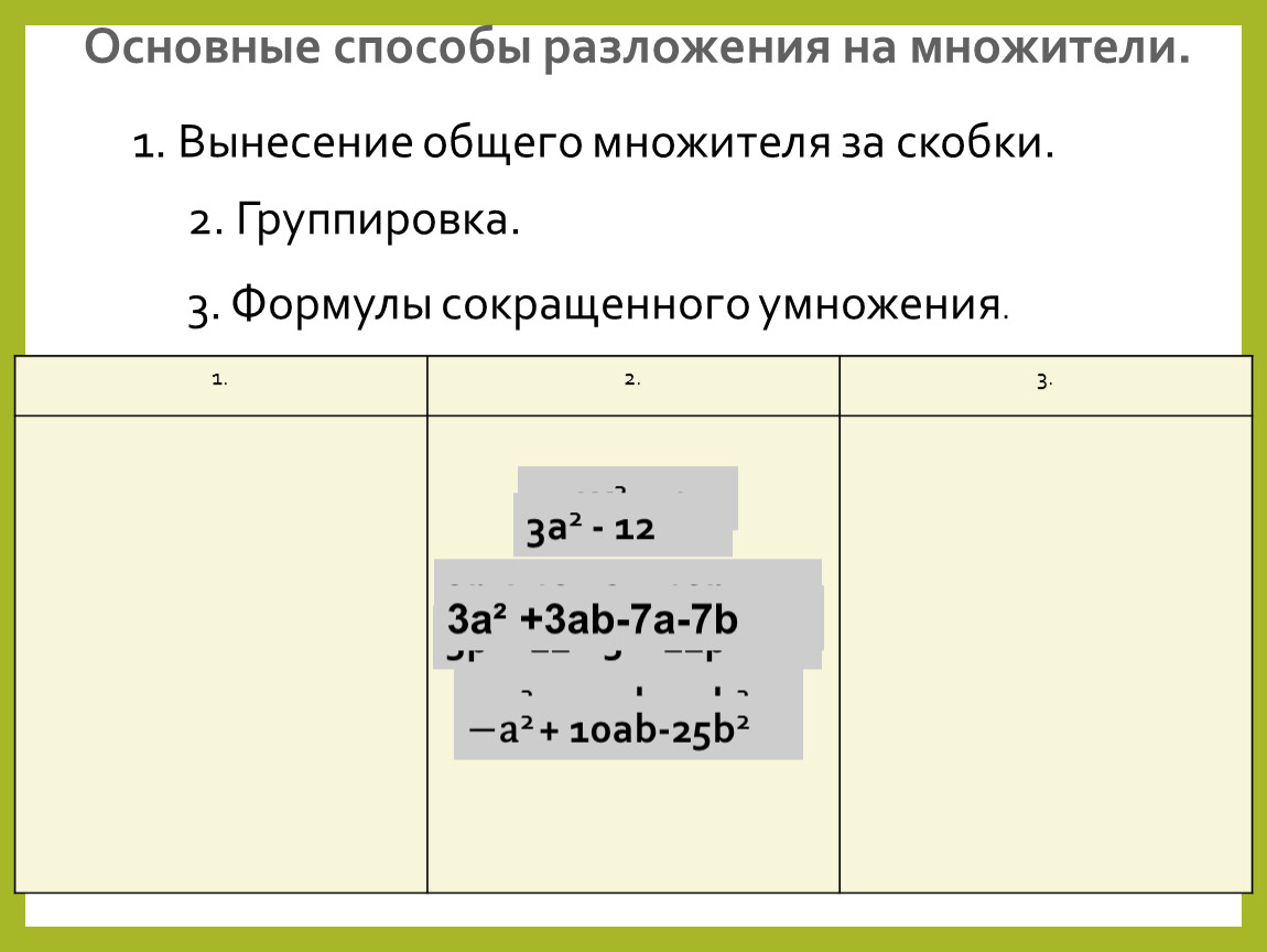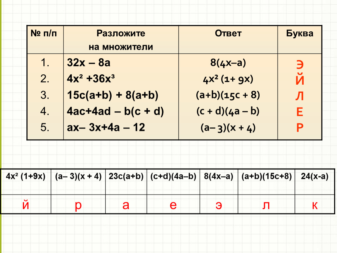 4х² (1+9х) | (a– 3)(x + 4) | 23с(а+b) | (c+d)(4a–b) | 8(4х–а) | (a+b)(15c+8) | 24(x-a) |