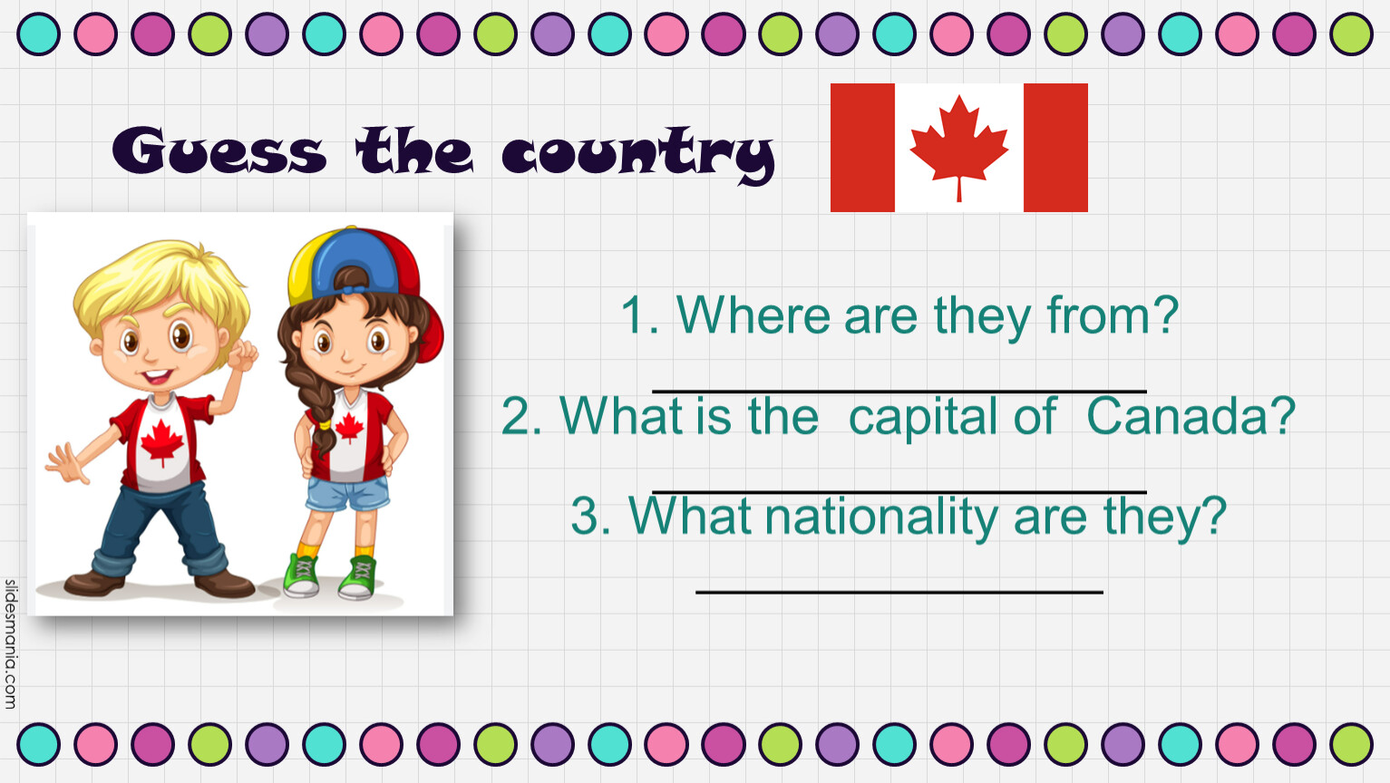1. Where are they from?_________________2. What is the capital of Canada?_________________3. What nationality are they?______________