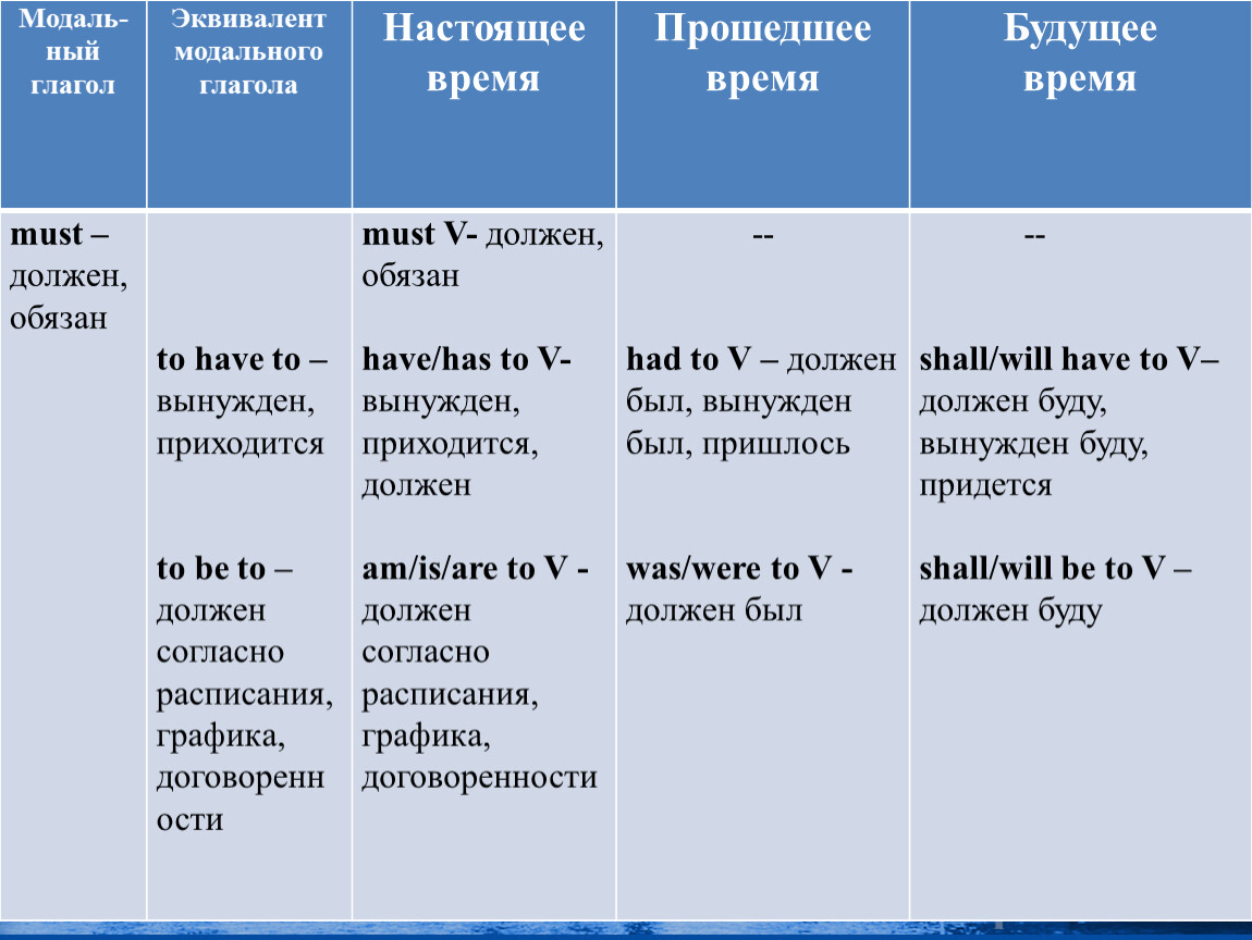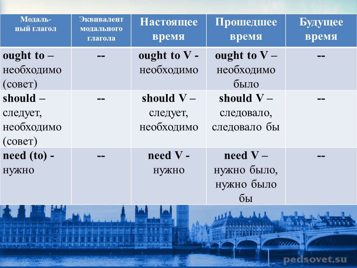 ought to – необходимо (совет) | -- | ought to V - необходимо | ought to V – необходимо было | -- |