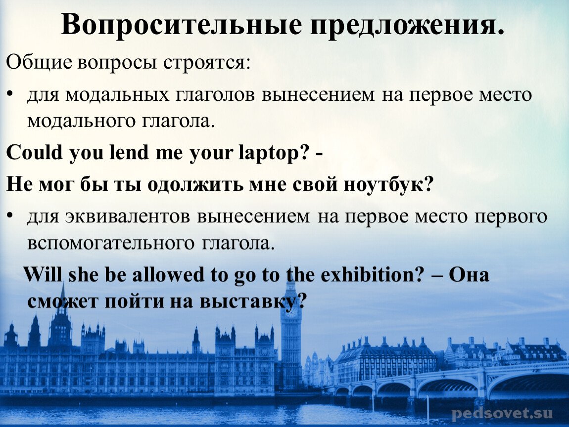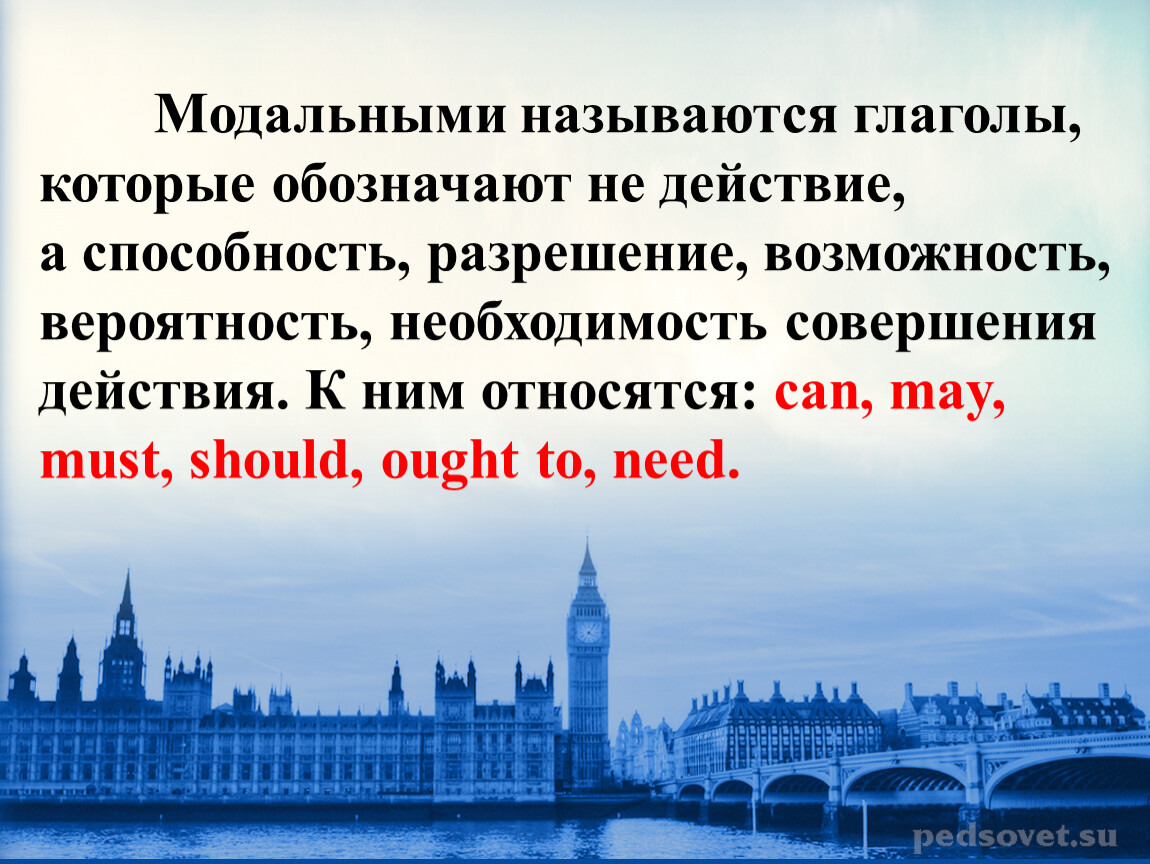 Модальными называются глаголы, которые обозначают не действие, а способность, разрешение, возможность, вероятность, необходимость совершения действия. К ним относятся: can, may, must, should, ought to, need.