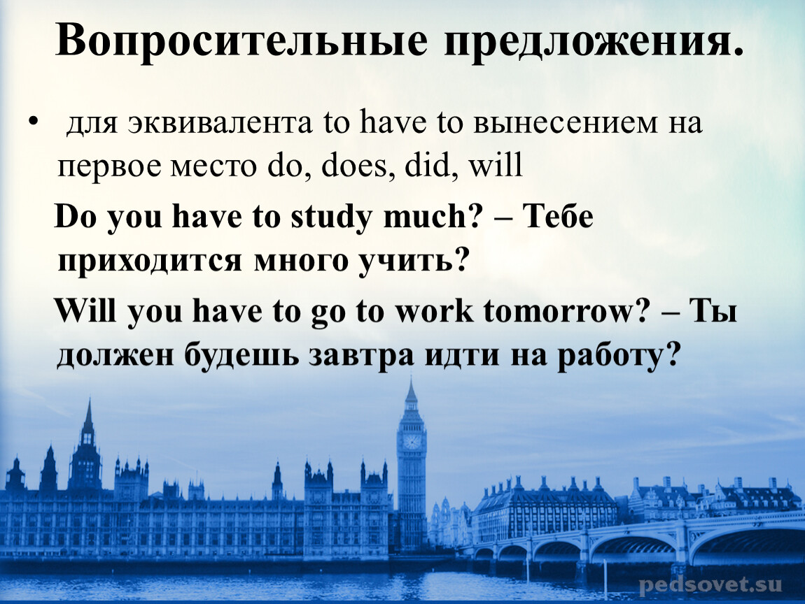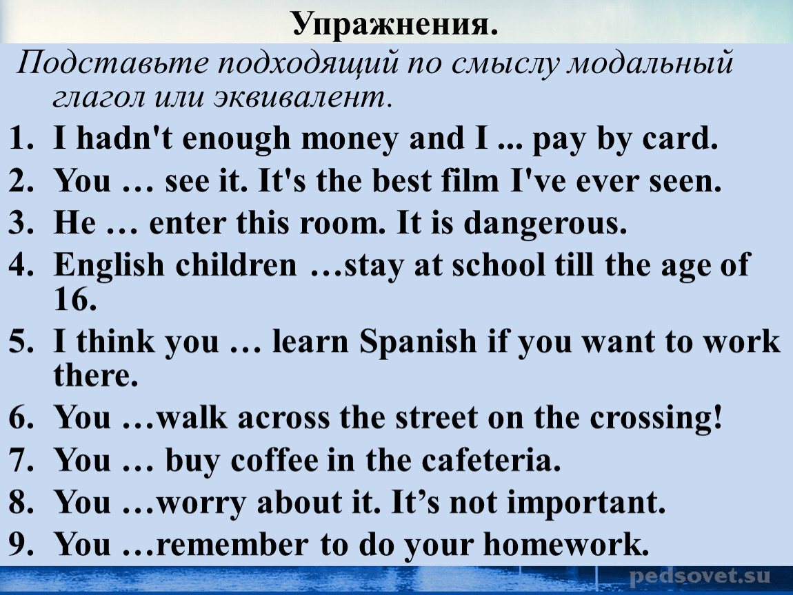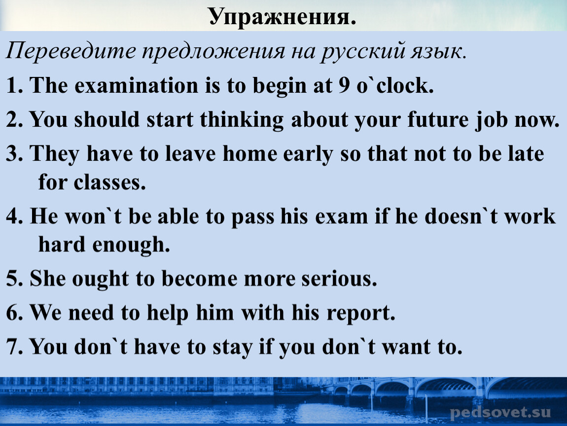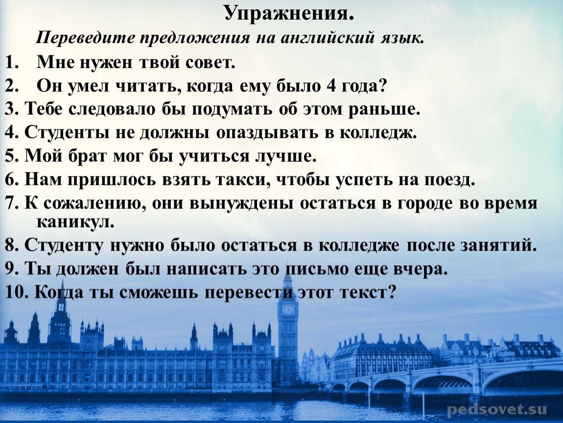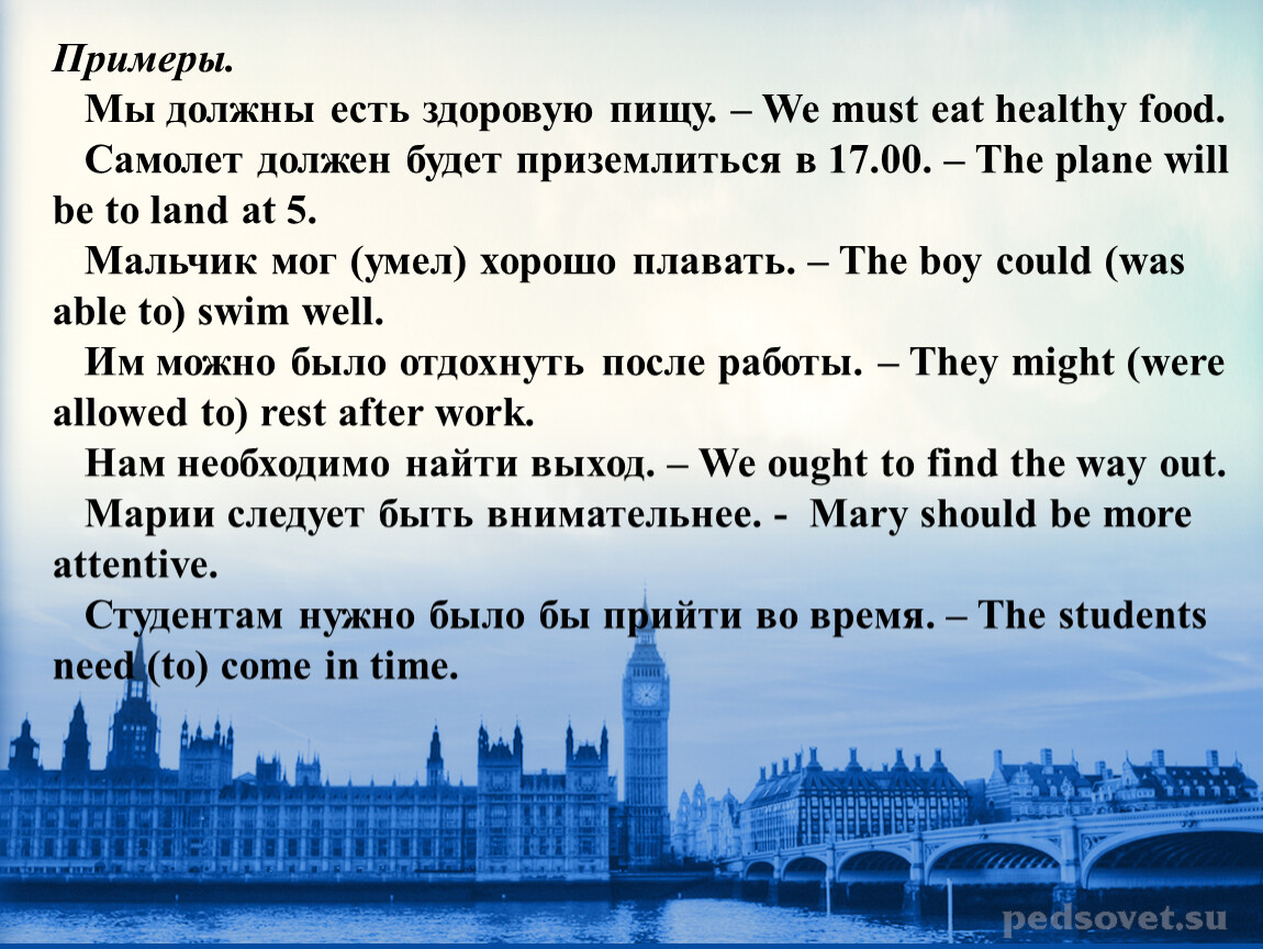 Примеры. Мы должны есть здоровую пищу. – We must eat healthy food. Самолет должен будет приземлиться в 17.00. – The plane will be to land at 5. Мальчик мог (умел) хорошо плавать. – The boy could (was able to) swim well. Им можно было отдохнуть после работы. – They might (were allowed to) rest after work. Нам необходимо найти выход. – We ought to find the way out. Марии следует быть внимательнее. - Mary should be more attentive. Студентам нужно было бы прийти во время. – The students need (to) come in time.