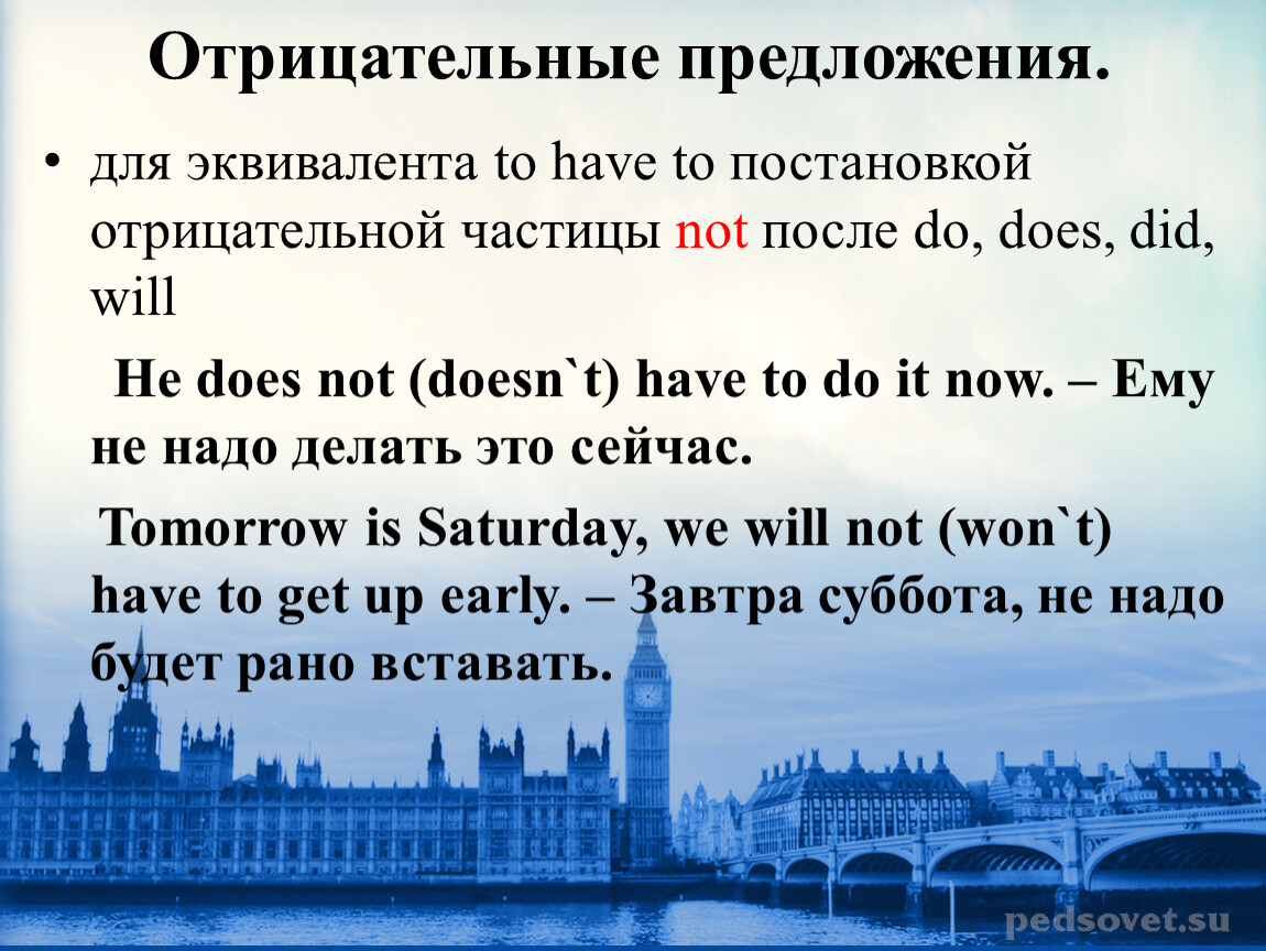 He does not (doesn`t) have to do it now. – Ему не надо делать это сейчас.