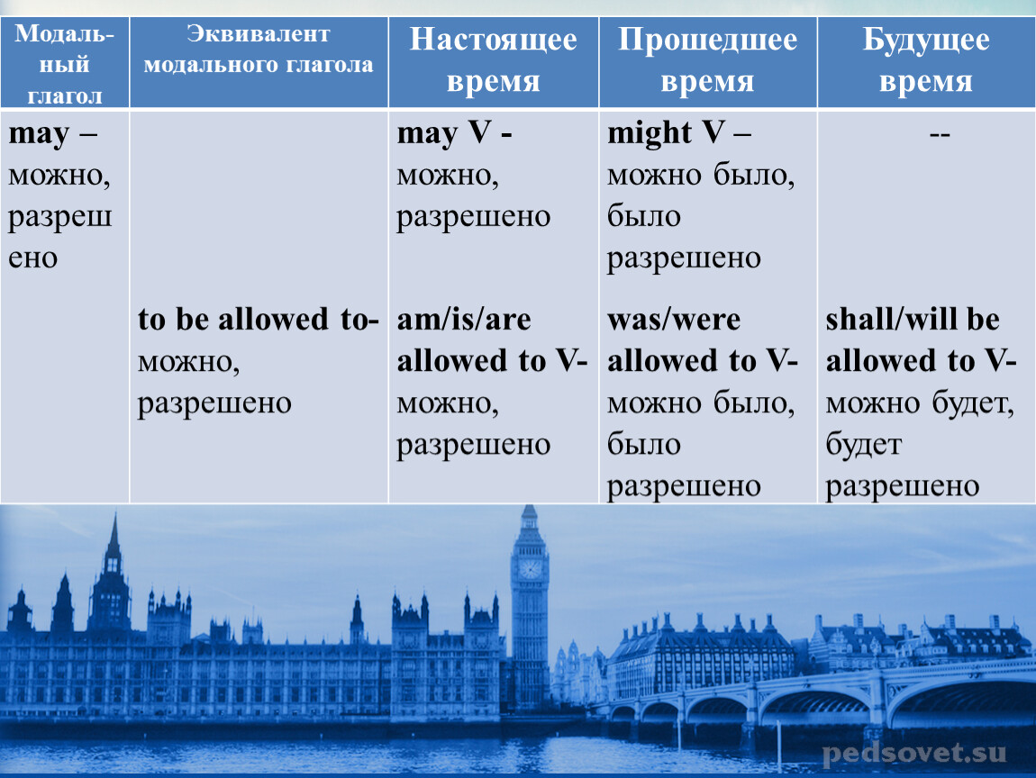 | may V - можно, разрешено | might V – можно было, было разрешено | -- |