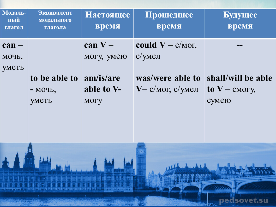 | can V – могу, умею | could V – с/мог, с/умел | -- |