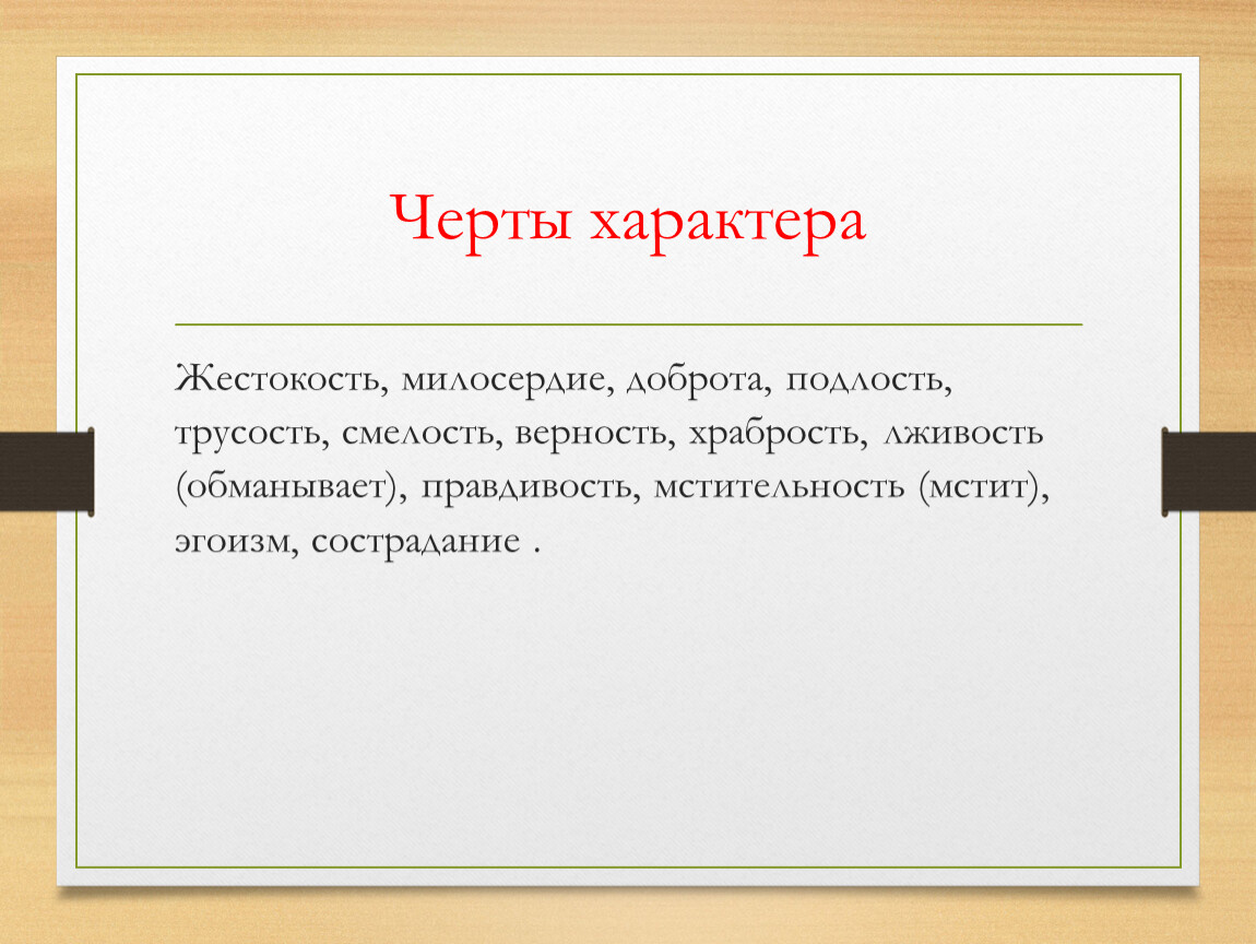 Жестокость, милосердие, доброта, подлость, трусость, смелость, верность, храбрость, лживость (обманывает), правдивость, мстительность (мстит), эгоизм, сострадание .