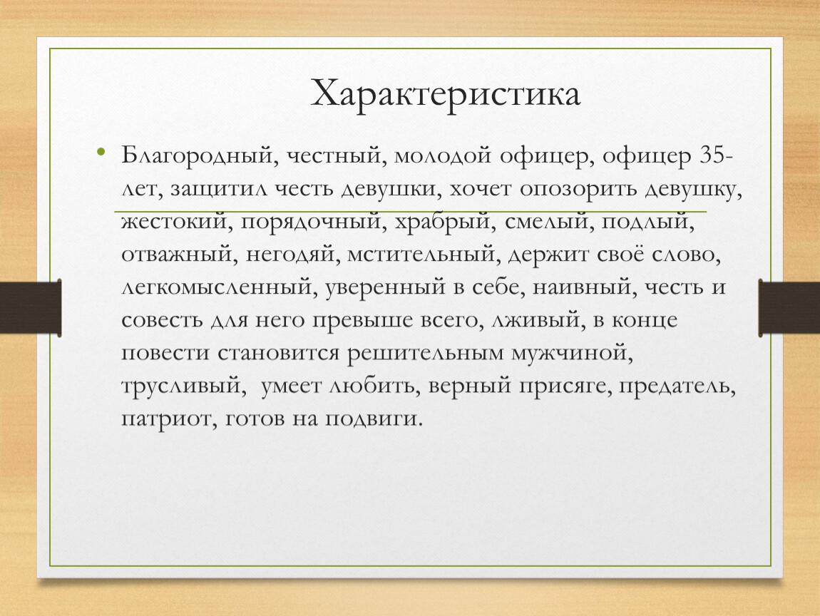 Благородный, честный, молодой офицер, офицер 35-лет, защитил честь девушки, хочет опозорить девушку, жестокий, порядочный, храбрый, смелый, подлый, отважный, негодяй, мстительный, держит своё слово, легкомысленный, уверенный в себе, наивный, честь и совесть для него превыше всего, лживый, в конце повести становится решительным мужчиной, трусливый, умеет любить, верный присяге, предатель, патриот, готов на подвиги.