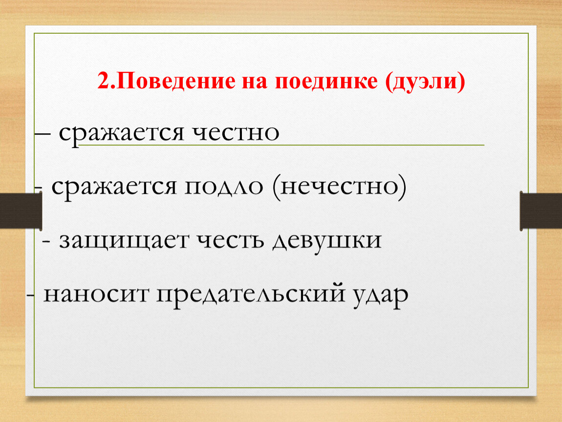 2 | Поведение на поединке (дуэли) | … | |