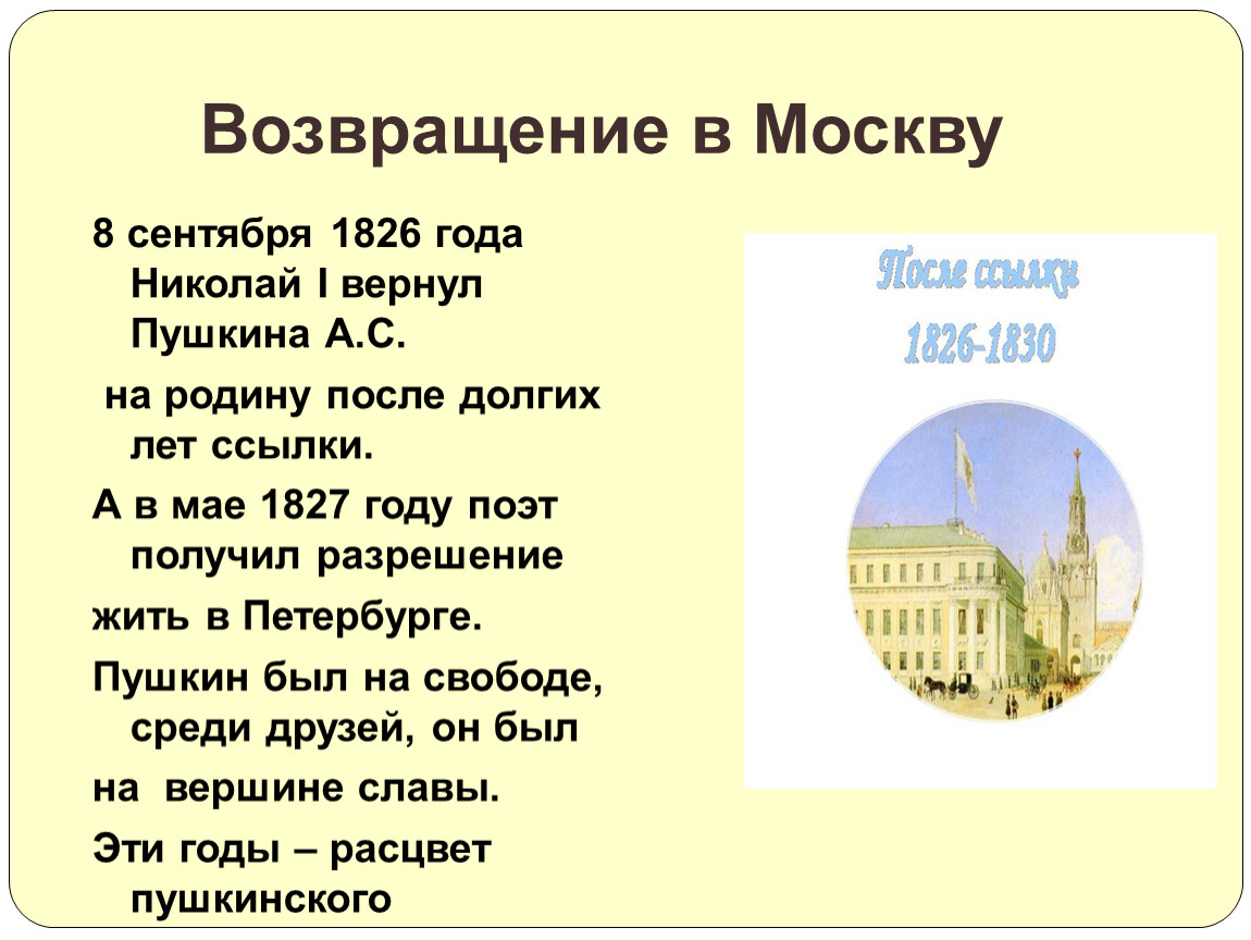 8 сентября 1826 года Николай I вернул Пушкина А.С.