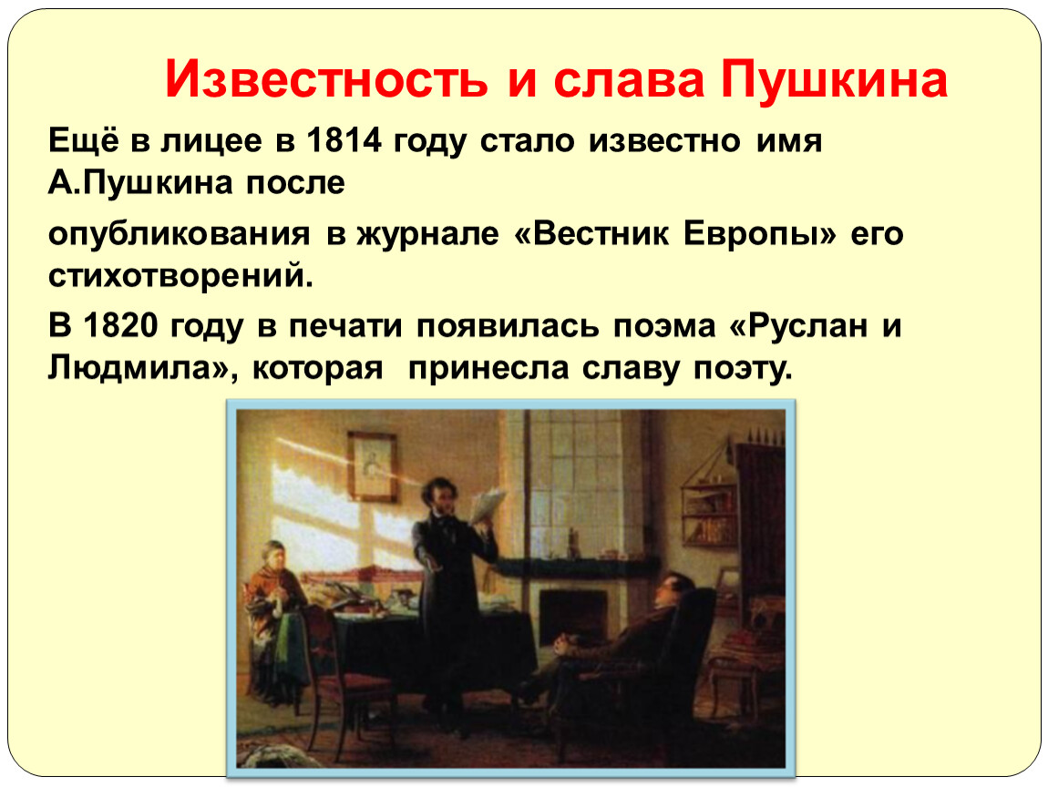 В 1820 году в печати появилась поэма «Руслан и Людмила», которая принесла славу поэту.