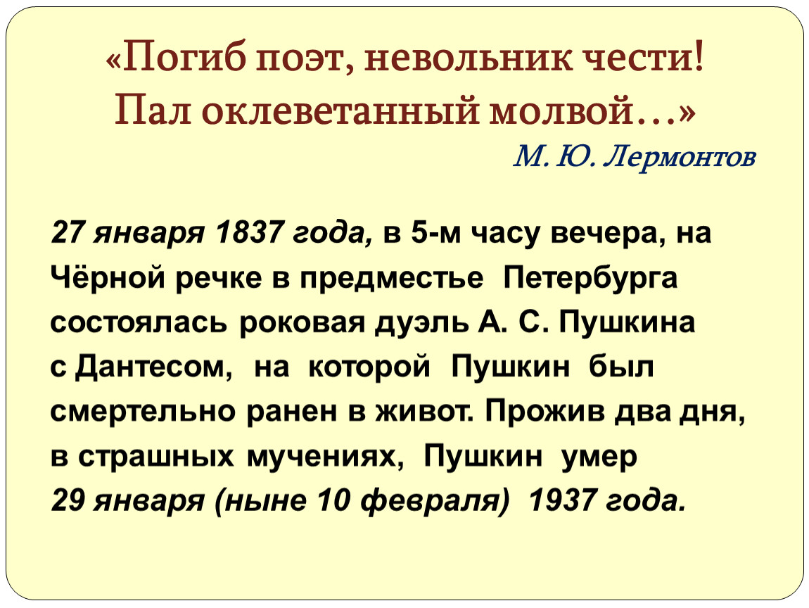 «Погиб поэт, невольник чести!Пал оклеветанный молвой…» М. Ю. Лермонтов