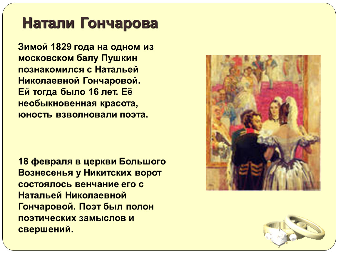Зимой 1829 года на одном из московском балу Пушкин познакомился с Натальей Николаевной Гончаровой.