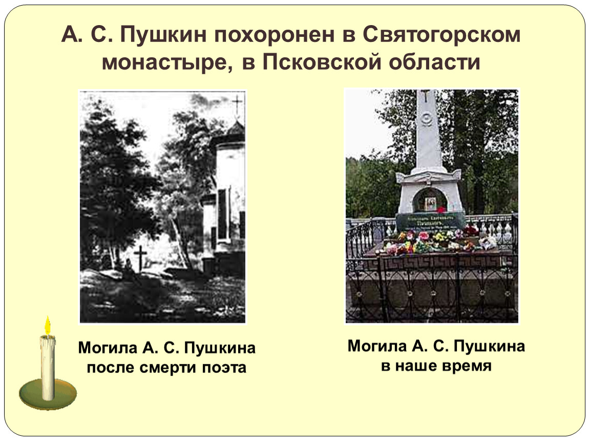 А. С. Пушкин похоронен в Святогорском монастыре, в Псковской области