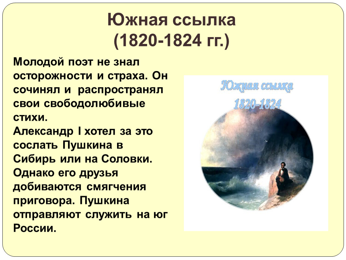 Александр I хотел за это сослать Пушкина в Сибирь или на Соловки. Однако его друзья добиваются смягчения приговора. Пушкина отправляют служить на юг России.