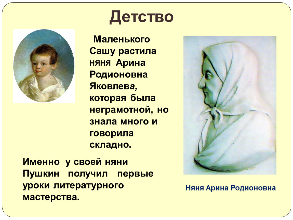 Маленького Сашу растила НЯНЯ Арина Родионовна Яковлева, которая была неграмотной, но знала много и говорила складно.