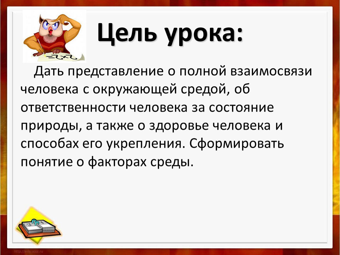 Дать представление о полной взаимосвязи человека с окружающей средой, об ответственности человека за состояние природы, а также о здоровье человека и способах его укрепления. Сформировать понятие о факторах среды.