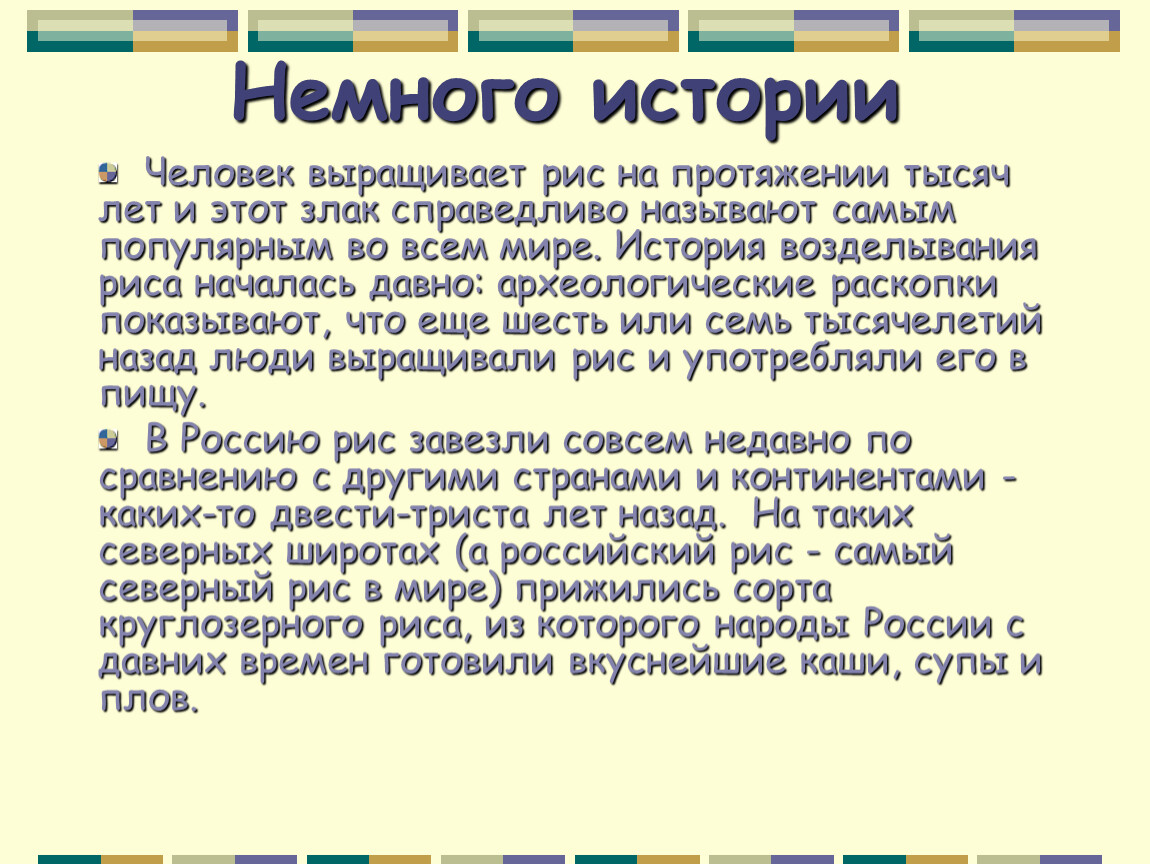 В Россию рис завезли совсем недавно по сравнению с другими странами и континентами - каких-то двести-триста лет назад. На таких северных широтах (а российский рис - самый северный рис в мире) прижились сорта круглозерного риса, из которого народы России с давних времен готовили вкуснейшие каши, супы и плов.