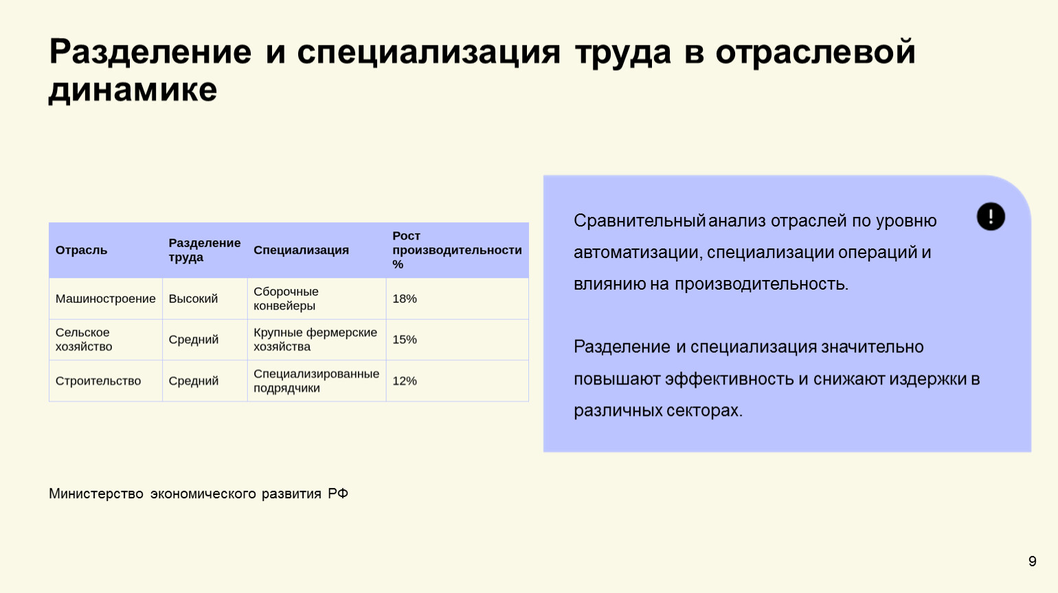 Сравнительный анализ отраслей по уровню автоматизации, специализации операций и влиянию на производительность. Разделение и специализация значительно повышают эффективность и снижают издержки в различных секторах.