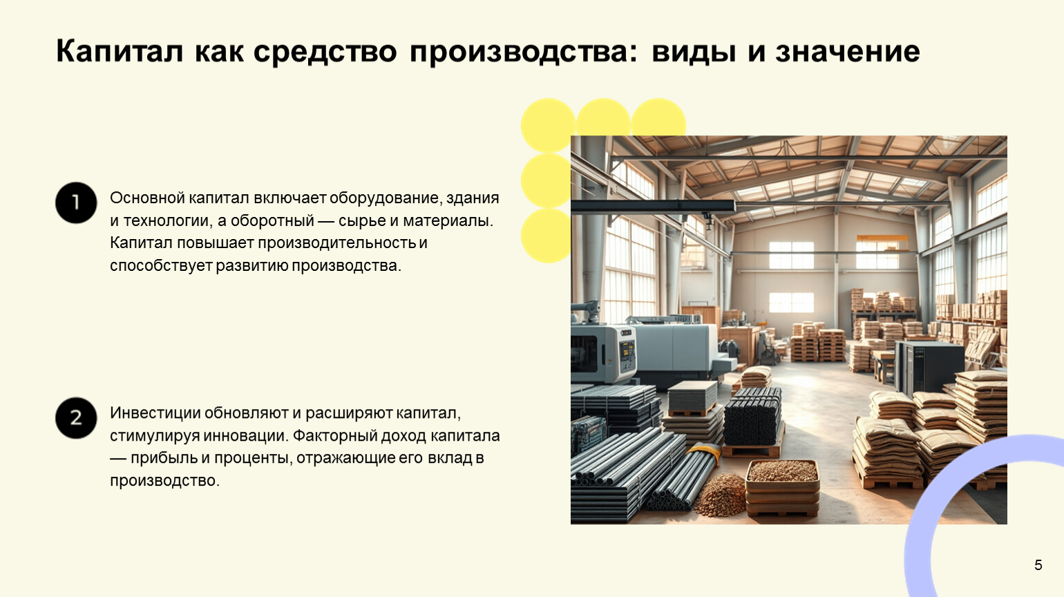 Основной капитал включает оборудование, здания и технологии, а оборотный — сырье и материалы. Капитал повышает производительность и способствует развитию производства.