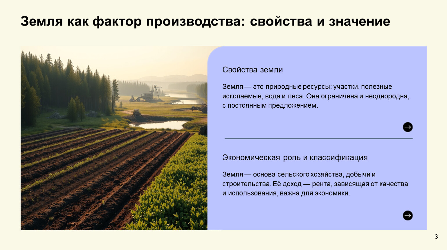 Экономическая роль и классификация Земля — основа сельского хозяйства, добычи и строительства. Её доход — рента, зависящая от качества и использования, важна для экономики.