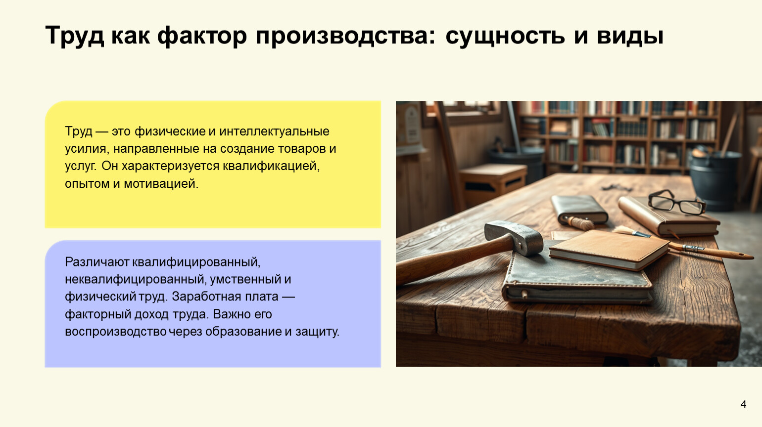Труд — это физические и интеллектуальные усилия, направленные на создание товаров и услуг. Он характеризуется квалификацией, опытом и мотивацией.