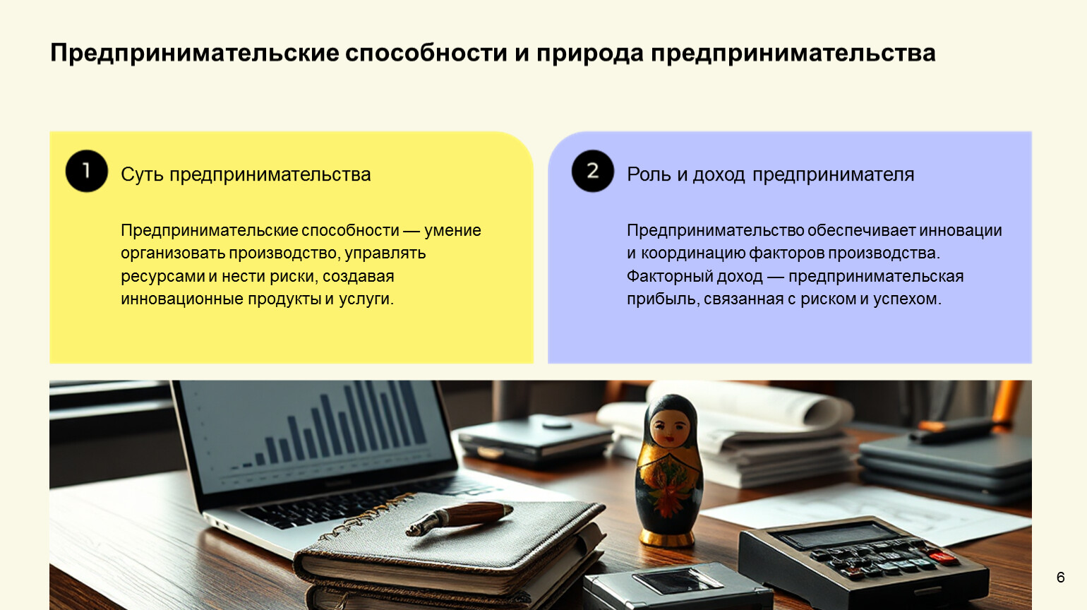 Роль и доход предпринимателя Предпринимательство обеспечивает инновации и координацию факторов производства. Факторный доход — предпринимательская прибыль, связанная с риском и успехом.