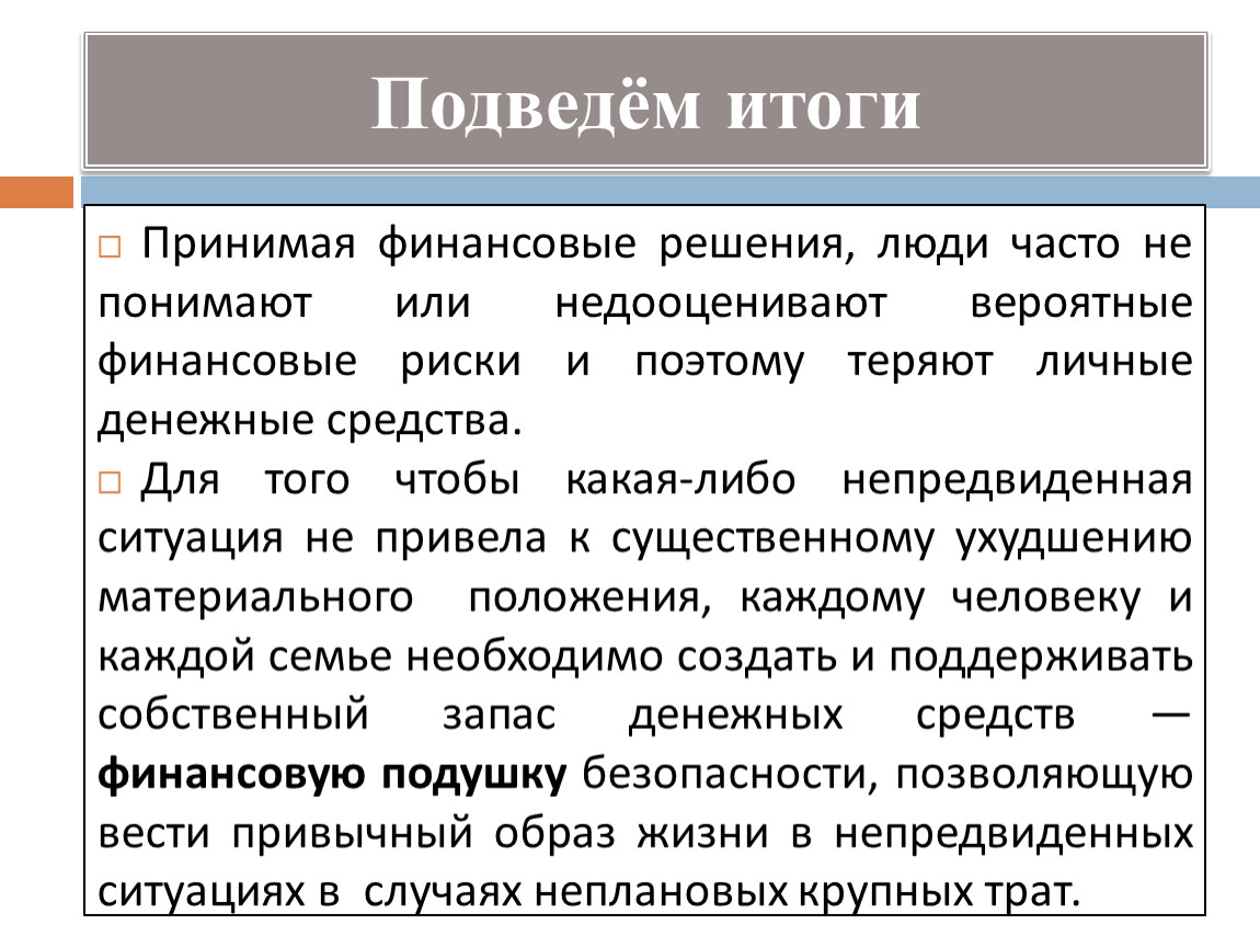 Для того чтобы какая-либо непредвиденная ситуация не привела к существенному ухудшению материального положения, каждому человеку и каждой семье необходимо создать и поддерживать собственный запас денежных средств — финансовую подушку безопасности, позволяющую вести привычный образ жизни в непредвиденных ситуациях в случаях неплановых крупных трат.