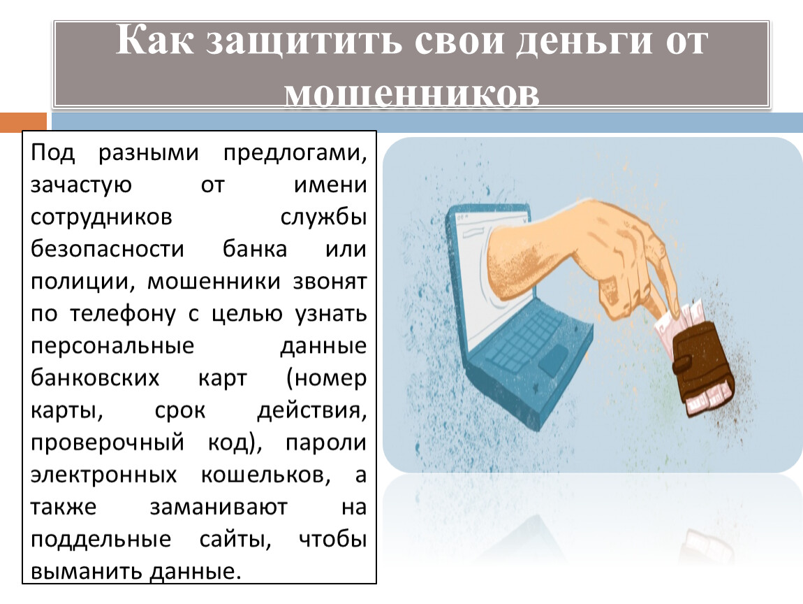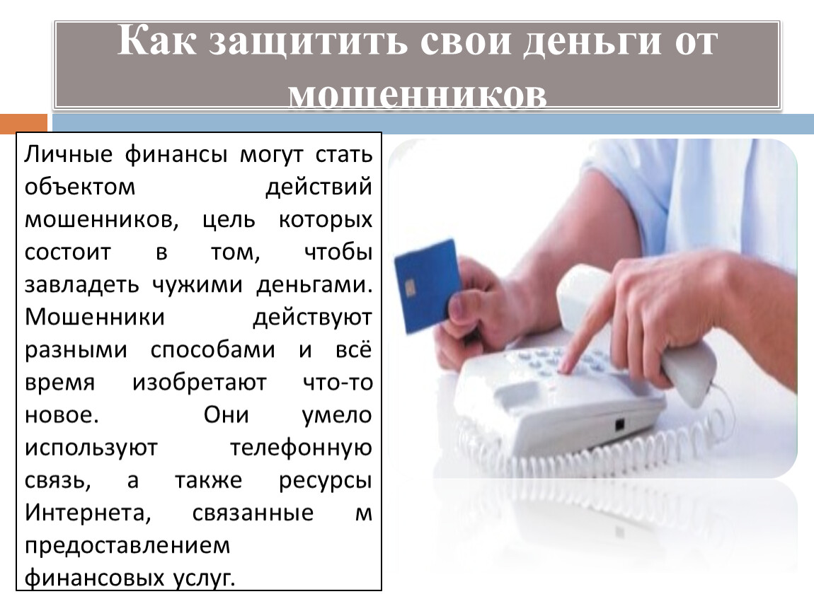 Личные финансы могут стать объектом действий мошенников, цель которых состоит в том, чтобы завладеть чужими деньгами. Мошенники действуют разными способами и всё время изобретают что-то новое. Они умело используют телефонную связь, а также ресурсы Интернета, связанные м предоставлением финансовых услуг.