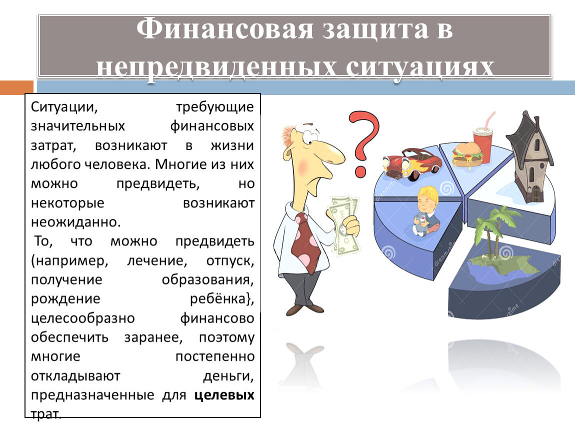То, что можно предвидеть (например, лечение, отпуск, получение образования, рождение ребёнка}, целесообразно финансово обеспечить заранее, поэтому многие постепенно откладывают деньги, предназначенные для целевых трат.