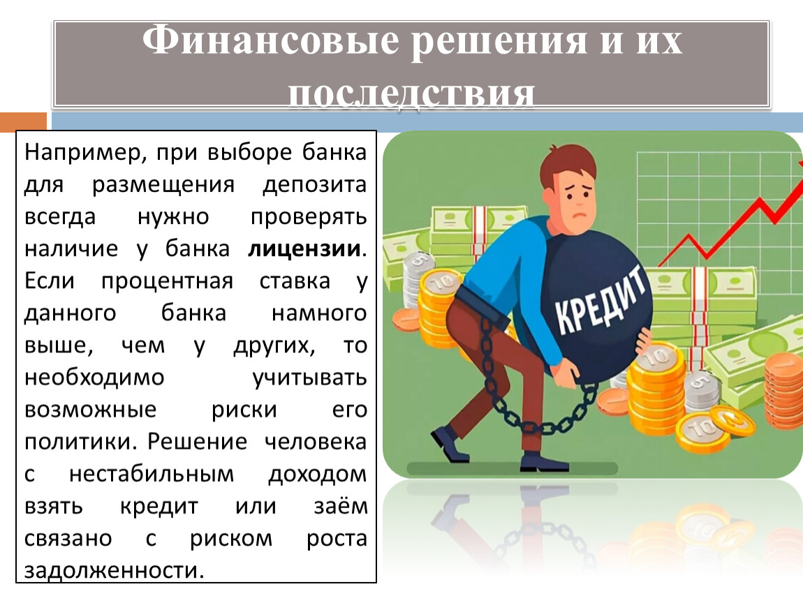 Например, при выборе банка для размещения депозита всегда нужно проверять наличие у банка лицензии. Если процентная ставка у данного банка намного выше, чем у других, то необходимо учитывать возможные риски его политики. Решение человека с нестабильным доходом взять кредит или заём связано с риском роста задолженности.