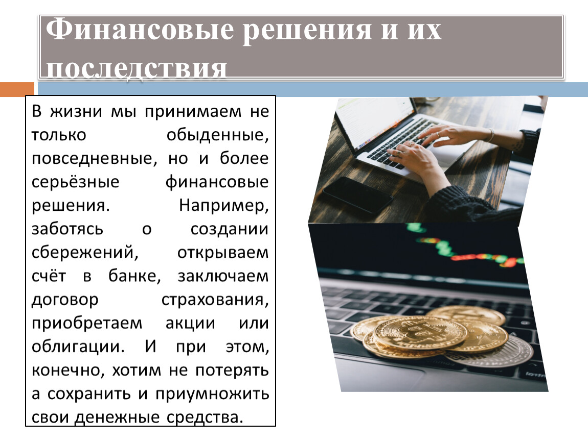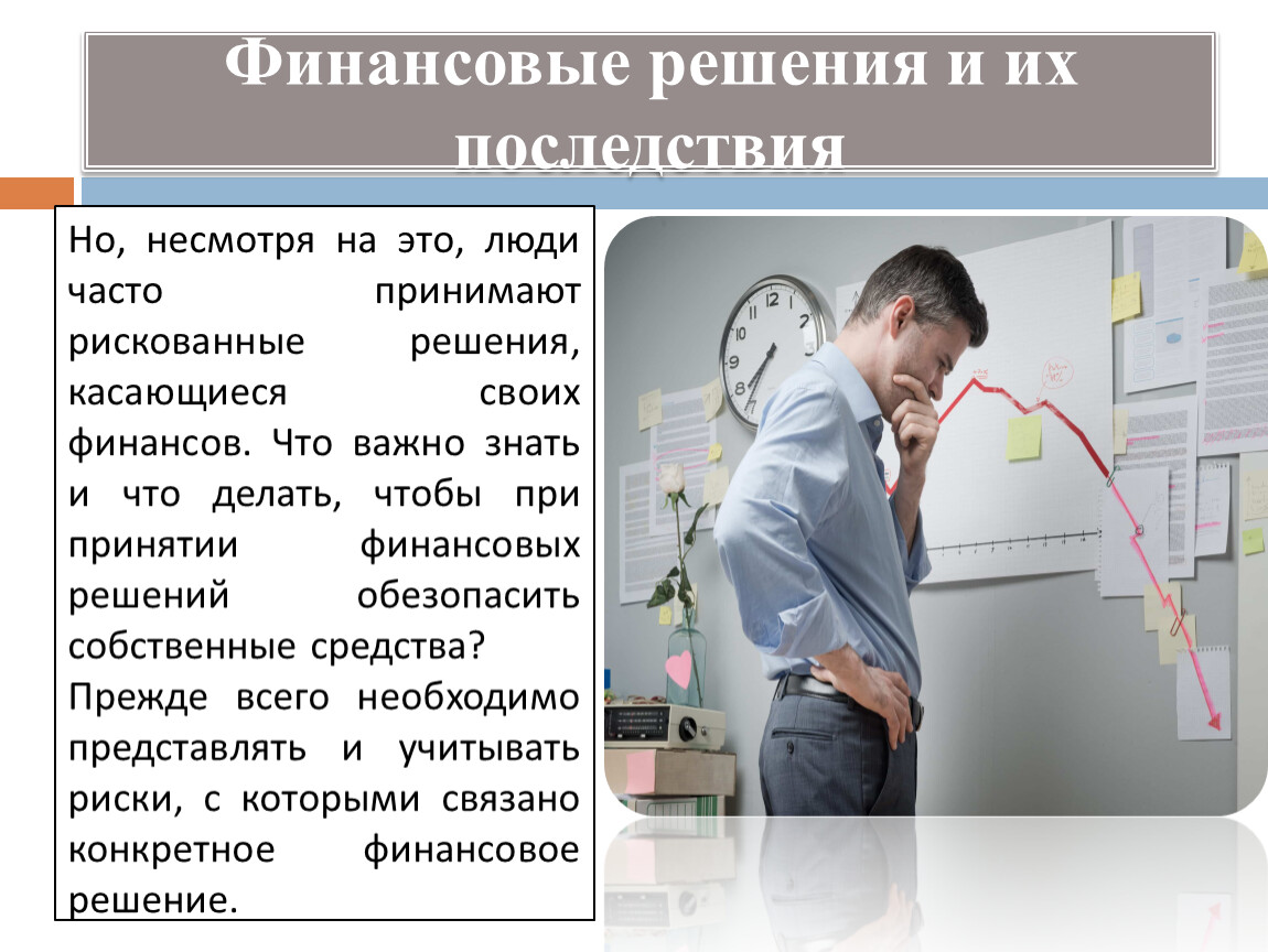 В жизни мы принимаем не только обыденные, повседневные, но и более серьёзные финансовые решения. Например, заботясь о создании сбережений, открываем счёт в банке, заключаем договор страхования, приобретаем акции или облигации. И при этом, конечно, хотим не потерять а сохранить и приумножить свои денежные средства.