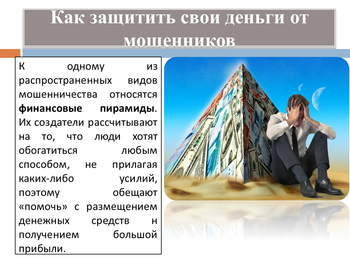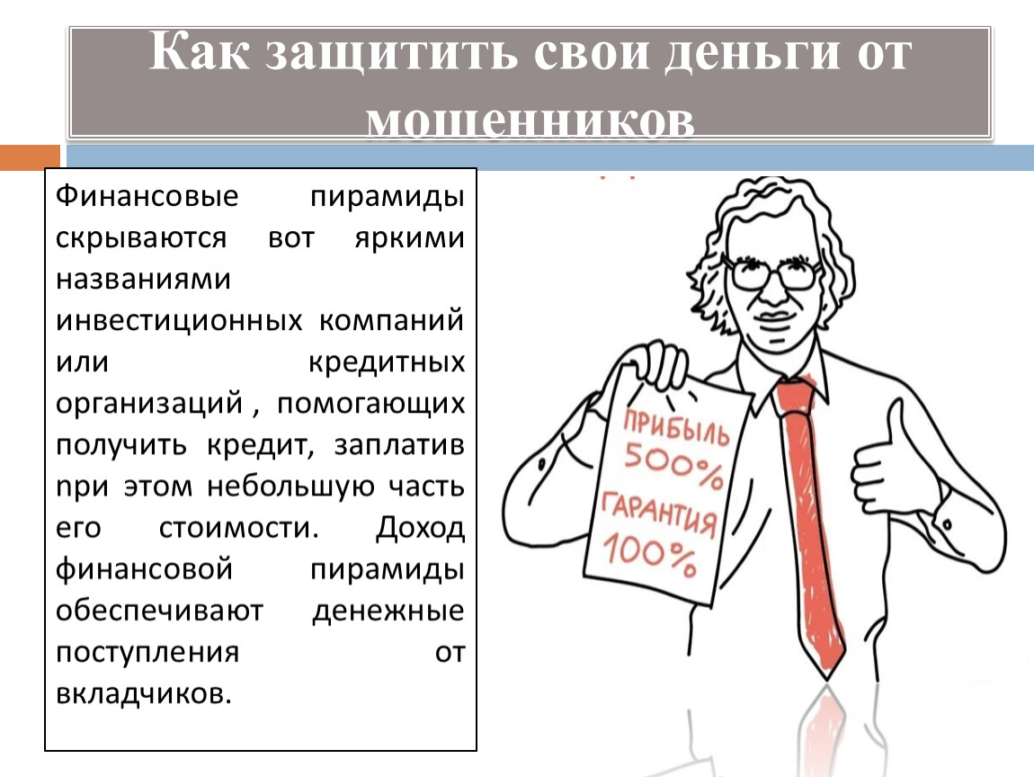 Финансовые пирамиды скрываются вот яркими названиями инвестиционных компаний или кредитных организаций , помогающих получить кредит, заплатив npи этом небольшую часть его стоимости. Доход финансовой пирамиды обеспечивают денежные поступления от вкладчиков.