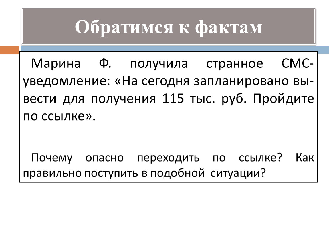 Марина Ф. получила странное СМС-уведомление: «На сегодня запланировано вы- вести для получения 115 тыс. руб. Пройдите по ссылке».