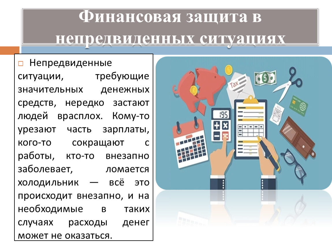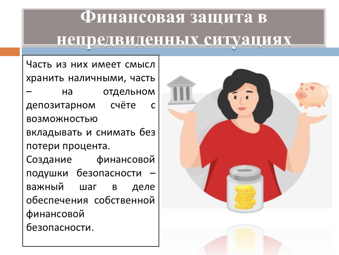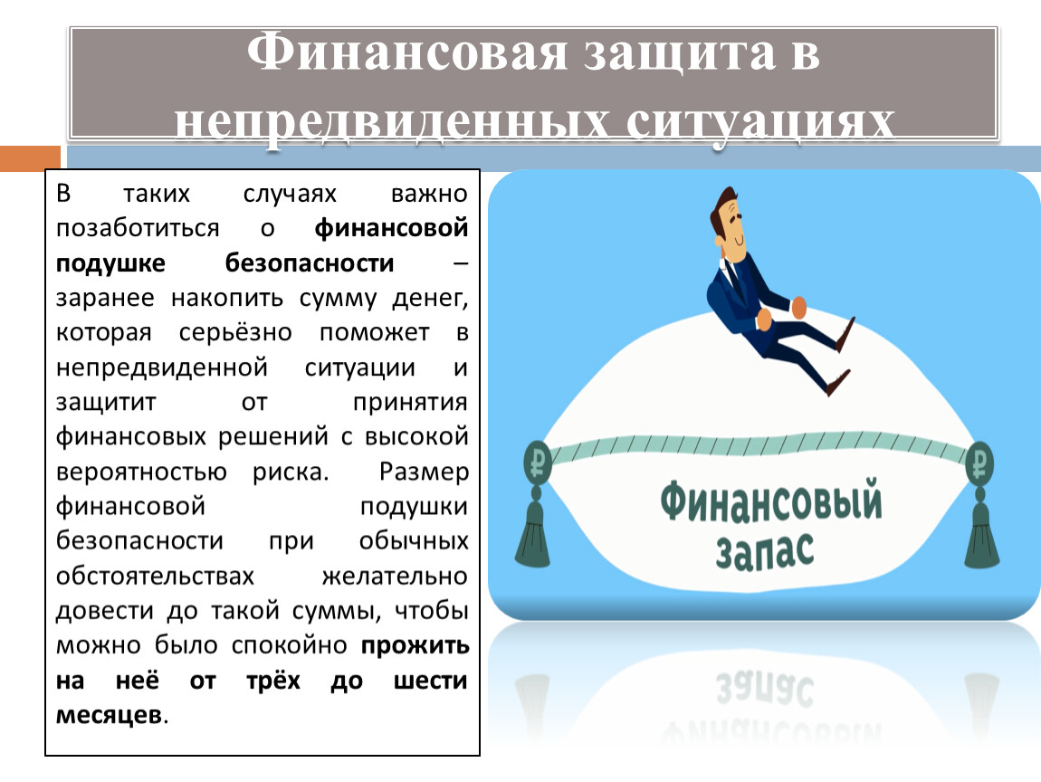 В таких случаях важно позаботиться о финансовой подушке безопасности – заранее накопить сумму денег, которая серьёзно поможет в непредвиденной ситуации и защитит от принятия финансовых решений с высокой вероятностью риска. Размер финансовой подушки безопасности при обычных обстоятельствах желательно довести до такой суммы, чтобы можно было спокойно прожить на неё от трёх до шести месяцев.