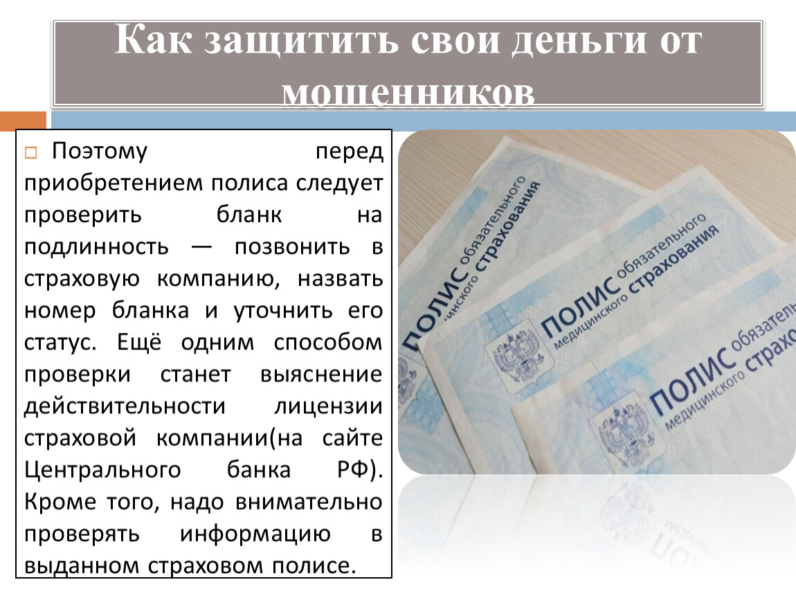 Поэтому пepeд приобретением полиса cлeдyeт проверить бланк на подлинность — позвонить в страховую компанию, назвать номер бланка и уточнить его статус. Ещё одним способом проверки станет выяснение действительности лицензии страховой компании(на сайте Центрального банка РФ). Кроме того, надо внимательно проверять информацию в выданном страховом полисе.
