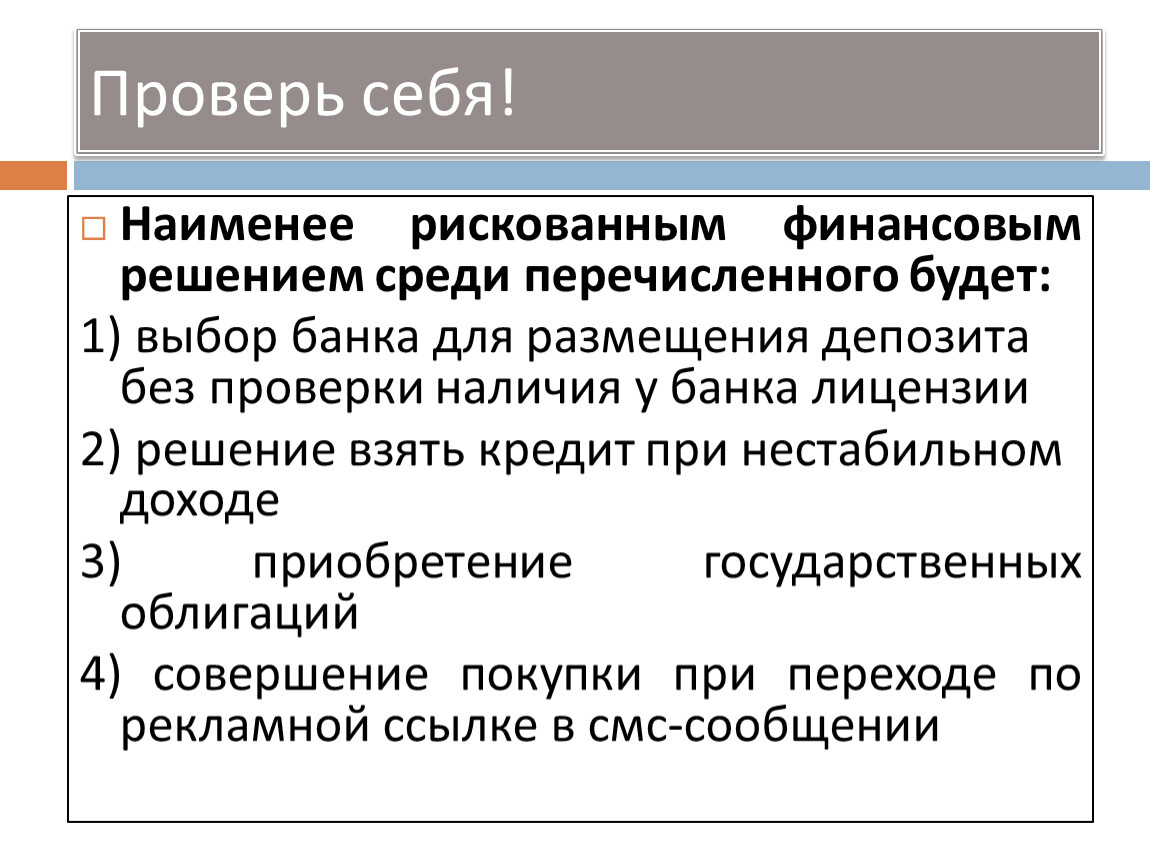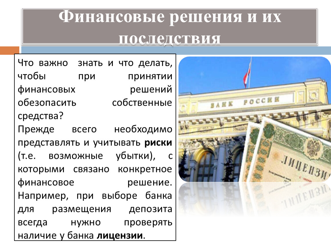 Прежде всего необходимо представлять и учитывать риски (т.е. возможные убытки), с которыми связано конкретное финансовое решение. Например, при выборе банка для размещения депозита всегда нужно проверять наличие у банка лицензии.