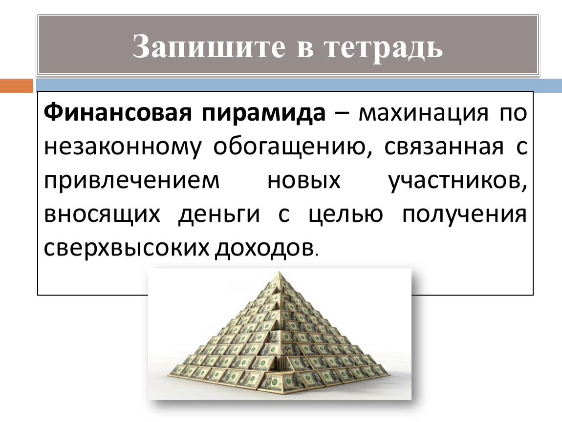 Финансовая пирамида – махинация по незаконному обогащению, связанная с привлечением новых участников, вносящих деньги с целью получения сверхвысоких доходов.