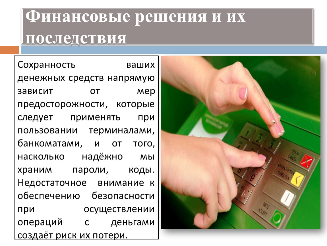 Сохранность ваших денежных средств напрямую зависит от мер предосторожности, которые следует применять при пользовании терминалами, банкоматами, и от того, насколько надёжно мы храним пароли, коды. Недостаточное внимание к обеспечению безопасности при осуществлении операций с деньгами создаёт риск их потери.