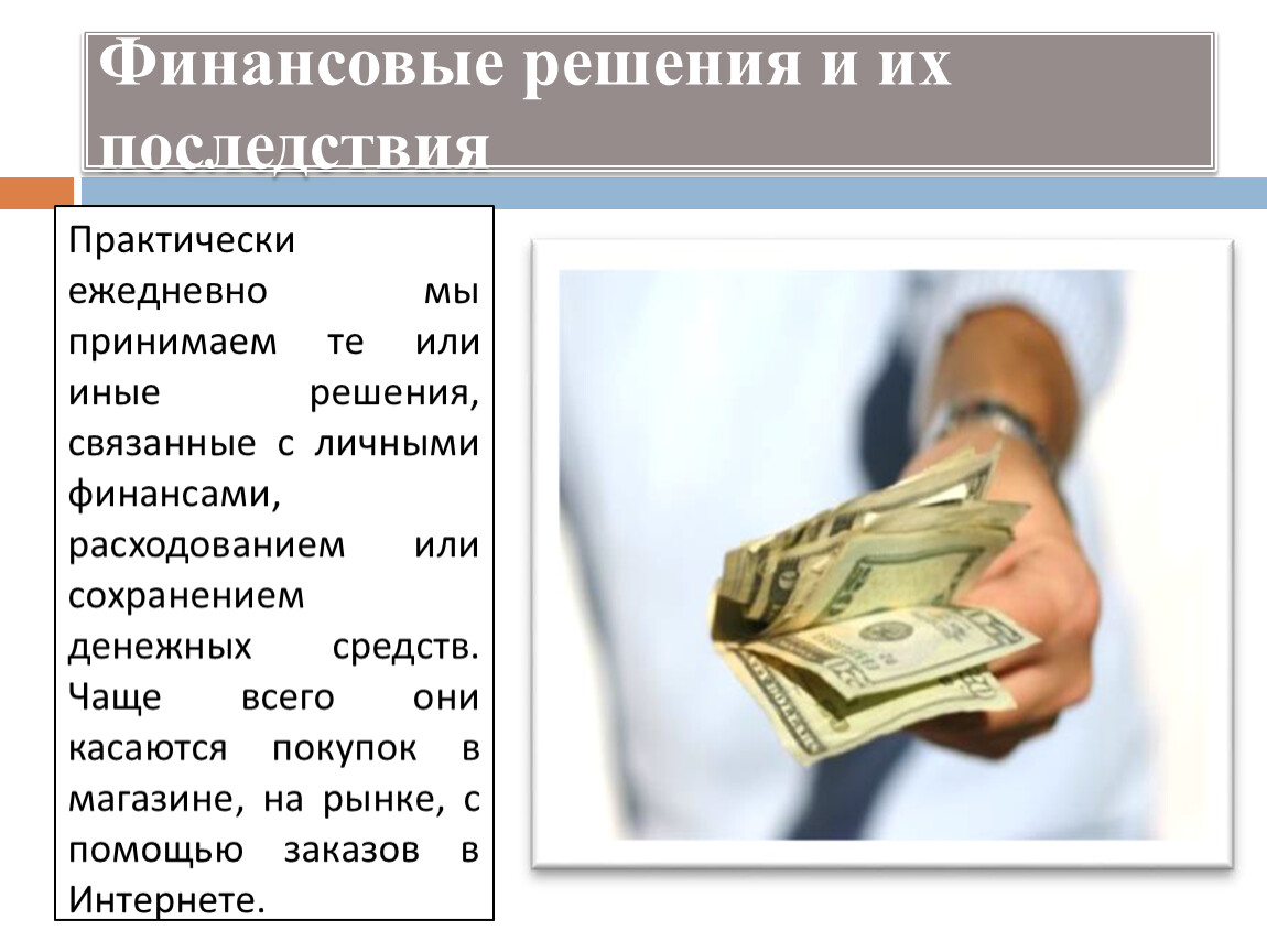Практически ежедневно мы принимаем те или иные решения, связанные с личными финансами, расходованием или сохранением денежных средств. Чаще всего они касаются покупок в магазине, на рынке, с помощью заказов в Интернете.