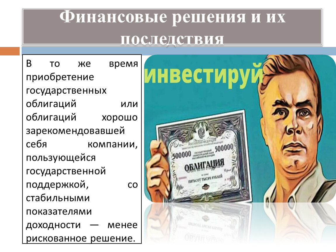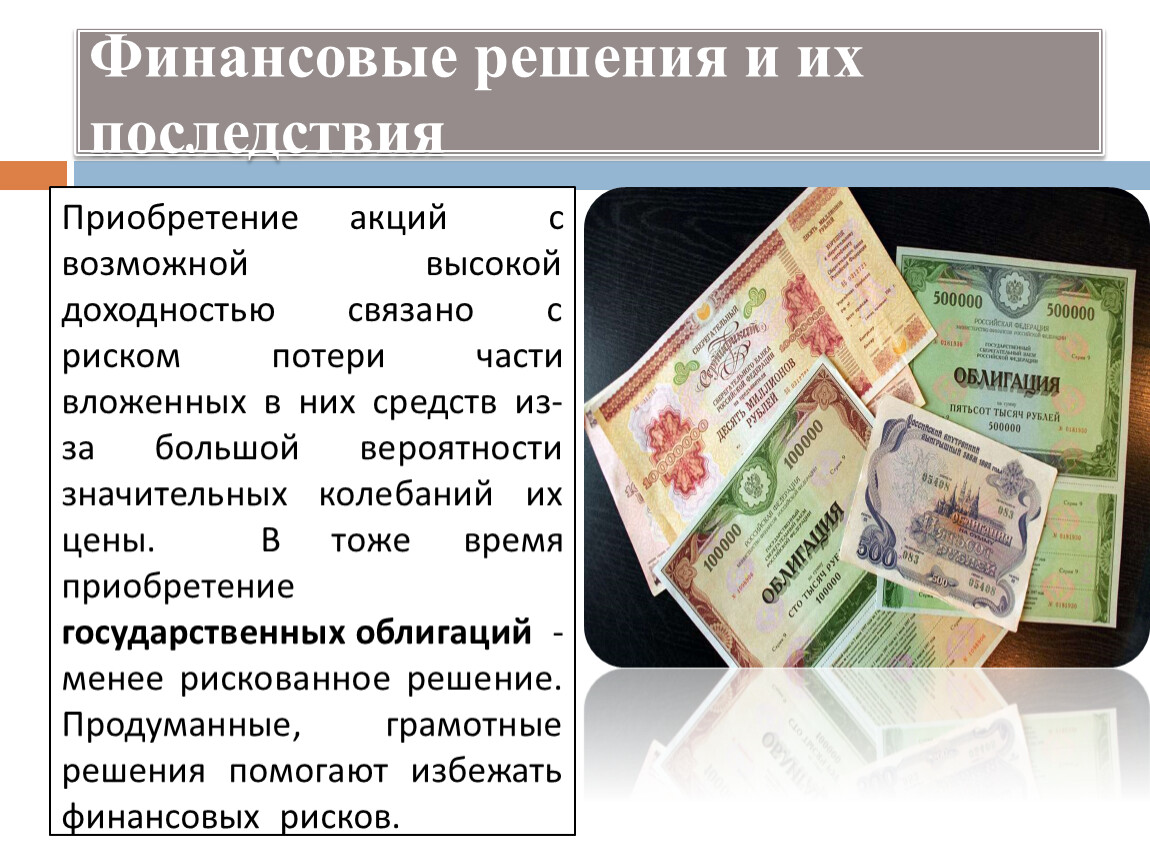 Приобретение акций с возможной высокой доходностью связано с риском потери части вложенных в них средств из-за большой вероятности значительных колебаний их цены. В тоже время приобретение государственных облигаций - менее рискованное решение. Продуманные, грамотные решения помогают избежать финансовых рисков.