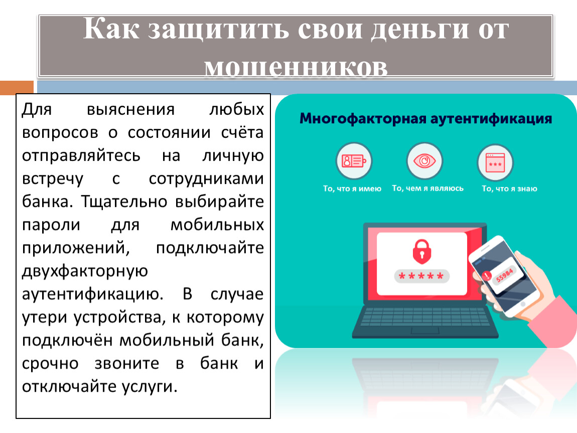 Для выяснения любых вопросов о состоянии счёта отправляйтесь на личную встречу с сотрудниками банка. Тщательно выбирайте пароли для мобильных приложений, подключайте двухфакторную аутентификацию. В случае утери устройства, к которому подключён мобильный банк, срочно звоните в банк и отключайте услуги.